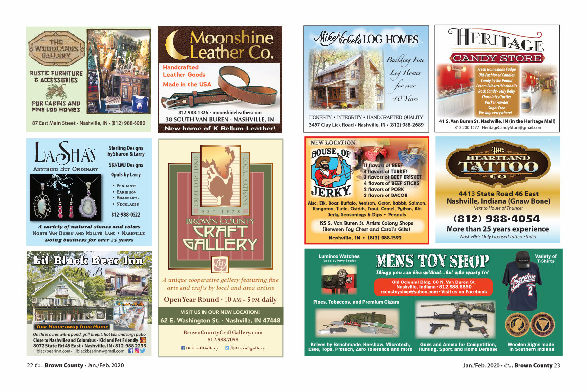 22 Our Brown County • Jan./ Feb. 2020 Anything But Ordinary Doing business for over 25 years North Van Buren and Molly’ s Lane • Nashville 812-988-0522 Sterling Designs by Sharon & Larry SBJ / LMJ Designs Opals by Larry • Pendants • Earrings • Bracelets • Necklaces A variety of natural stones and colors A unique cooperative gallery featuring fine arts and crafts by local and area artists Open Year Round · 10 AM- 5 PM daily VISIT US IN OUR NEW LOCATION! 62 E. Washington St. · Nashville, IN 47448 BrownCountyCraftGallery. com 812.988.7058 BCCraftGallery @ BCcraftgallery created by hand local artisans E S T 1 9 7 8 BROWN COUNTY BROWN COUNTY 87 East Main Street • Nashville, IN •( 812) 988-6080 Lil Black Bear Inn On three acres with a pond, grill, firepit, hot tub, and large patio Close to Nashville and Columbus • Kid and Pet Friendly Your Home away from Home 8072 State Rd 46 East • Nashville, IN • 812-988-2233 lilblackbearinn. com • lilblackbearinn @ gmail. com Bre Bre Bre Bre Bre Bre Bre Br Br Bre Br Bre re re Br Br Br Bre Bre Bre Bre Br Bre Bre Bre Bre Bre re re Br Bre Bre Bre Bre Bre Bre Bre re re Bre Bre re re Bre Bre r Bre Bre Bre Bre Bre Br Br Bre Bre Bre Bre re re Bre re Bre Bre re Bre Bre Bre Bre re Bre re Br Bre Bre Br Bre Bre Bre Bre Bre re Bre Bre Bre Br Bre Bre Bre Bre Bre Bre Br Bre Br Bre Br B e Break akf akf kf akf akf akf akf kf akf akf akf akf akf akf akf akf akf akf akf ak a f a as as as as as as as ast ast ast ast st ast st as as as as ast st as ast as ast as ast ast s ast st ast as ast ast ast as ast ast ast s ast ast as ast ast as ast ast as as as as Da Da Da Da Da Da Da Da Da Da Da Da Da Da Da Da Da Da Da Da Da Da D il il il il ily ly ily il ily ily ily ily ly ly ily ily ily ly ly Breakfast Daily B & B Moonshine Leather Co. 812.988.1326 · moonshineleather. com 38 SOUTH VAN BUREN · NASHVILLE, IN New home of K Bellum Leather! Handcrafted Leather Goods Made in the USA