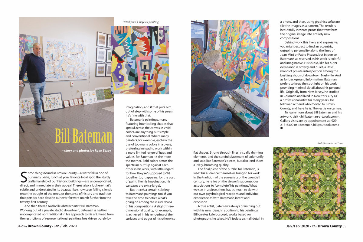 And then there’ s Nashville abstract artist Bill Bateman. Working out of a private studio downtown, Bateman is neither uncomplicated nor traditional in his approach to his art. Freed from the restrictions of representational painting, he’ s driven purely by
