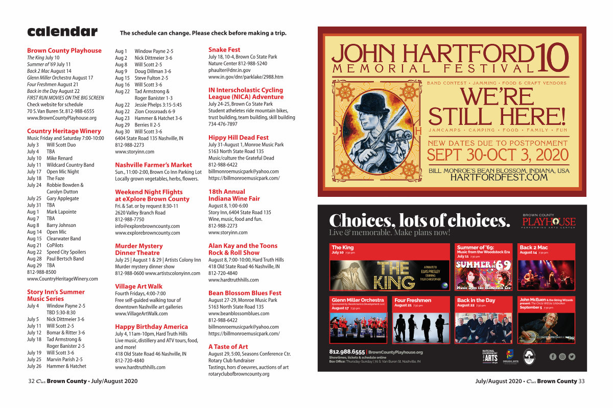 The King July 10 Summer of‘ 69 July 11 Back 2 Mac August 14 Glenn Miller Orchestra August 17 Four Freshmen August 21 Back in the Day August 22 FIRST RUN MOVIES ON THE BIG SCREEN Check website for schedule 70 S. Van Buren St. 812-988-6555 www. BrownCountyPlayhouse. org