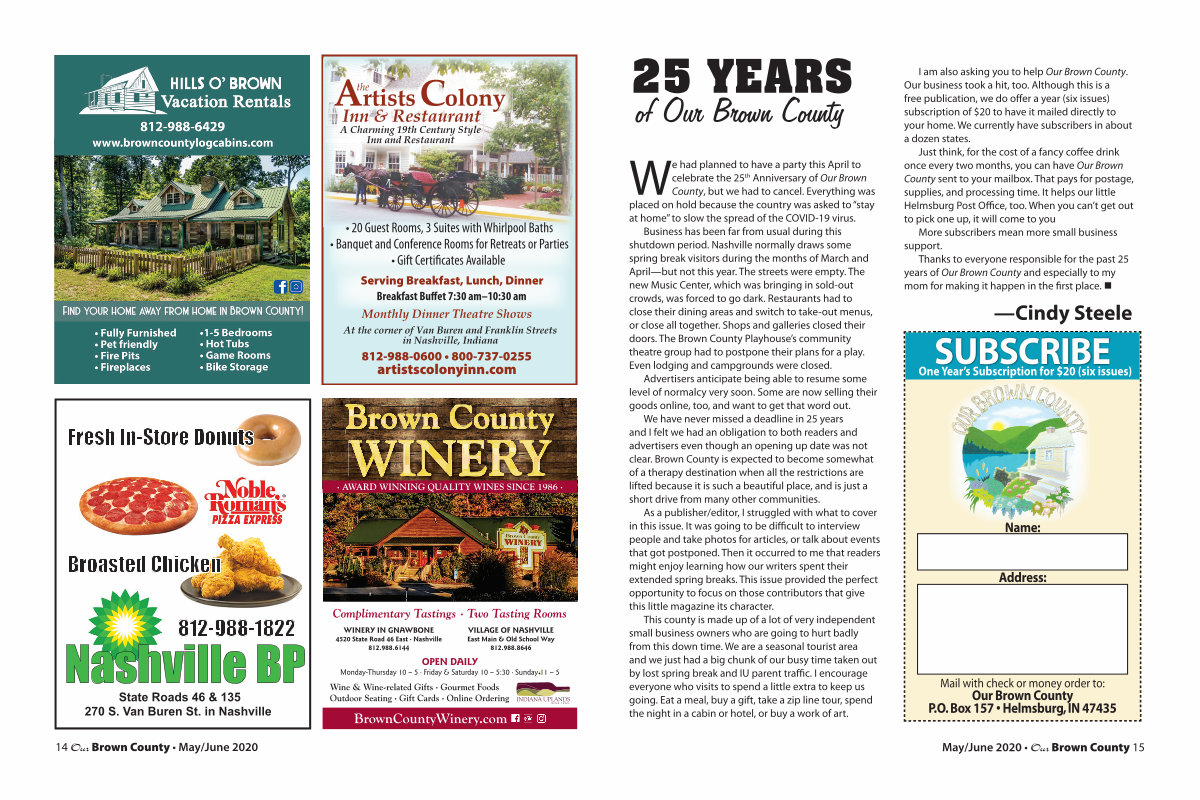 I am also asking you to help Our Brown County. Our business took a hit, too. Although this is a free publication, we do offer a year( six issues) subscription of $ 20 to have it mailed directly to your home. We currently have subscribers in about a dozen states.