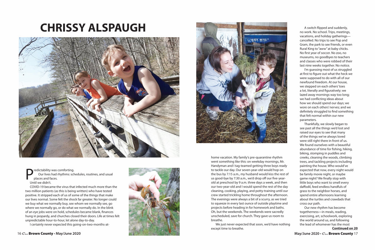 home vacation. My family’ s pre-quarantine rhythm went something like this: on weekday mornings, Mr. Handyman and I tag-teamed getting three boys ready to tackle our day. Our seven-year-old would hop on the bus by 7:15 a. m., my husband would kiss the rest of us good-bye by 7:30 a. m., we’ d drop off our five-yearold at preschool by 9 a. m. three days a week, and then our two-year-old and I would spend the rest of the day cleaning, cooking, playing, and potty-training until our crew started trickling home throughout the afternoon. The evenings were always a bit of a scurry, as we tried to squeeze in every last ounce of outside playtime and projects before heading in for homework and baths. Oh, but the weekends. The weekends were sacredly unscheduled, save for church. They gave us room to breathe.