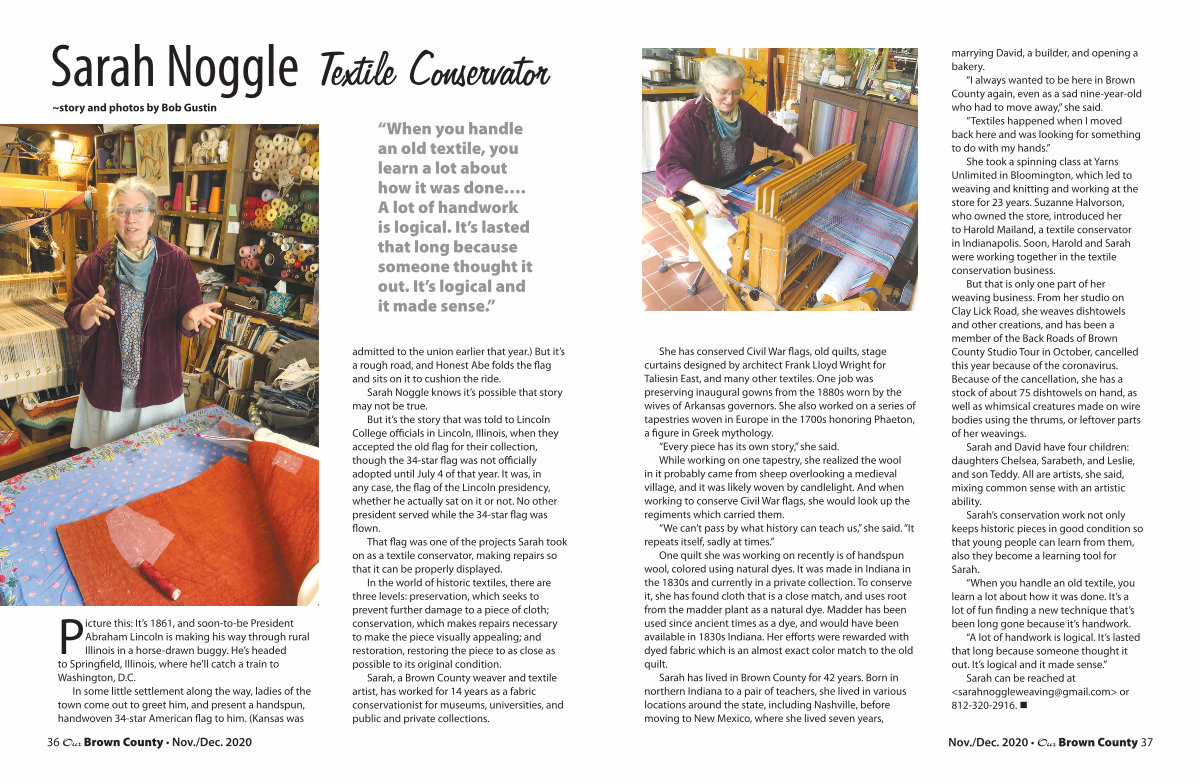 She took a spinning class at Yarns Unlimited in Bloomington, which led to weaving and knitting and working at the store for 23 years. Suzanne Halvorson, who owned the store, introduced her to Harold Mailand, a textile conservator in Indianapolis. Soon, Harold and Sarah were working together in the textile conservation business.
