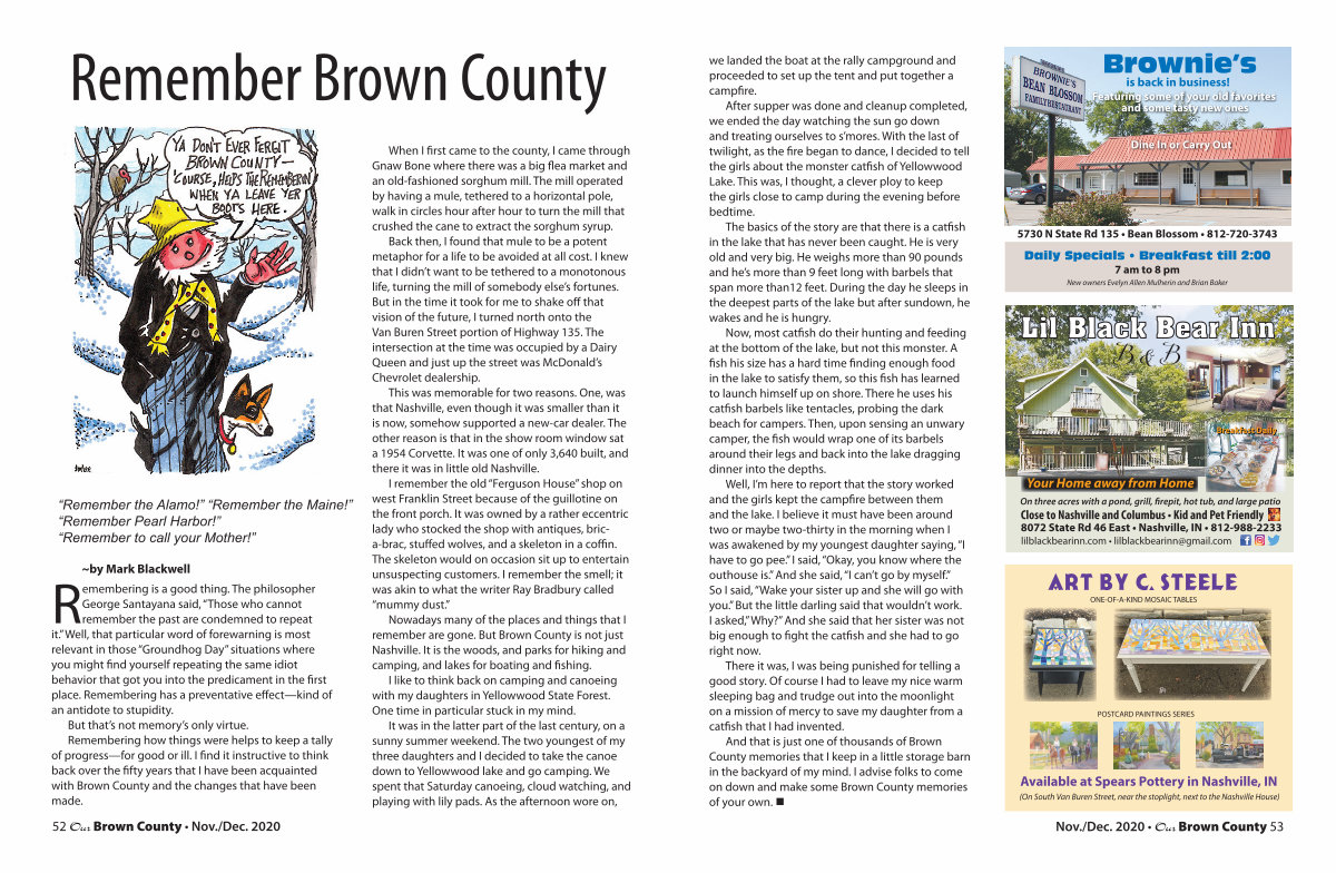 Remembering is a good thing. The philosopher George Santayana said,“ Those who cannot remember the past are condemned to repeat it.” Well, that particular word of forewarning is most relevant in those“ Groundhog Day” situations where you might find yourself repeating the same idiot behavior that got you into the predicament in the first place. Remembering has a preventative effect— kind of an antidote to stupidity. But that’ s not memory’ s only virtue. Remembering how things were helps to keep a tally of progress— for good or ill. I find it instructive to think back over the fifty years that I have been acquainted with Brown County and the changes that have been made.