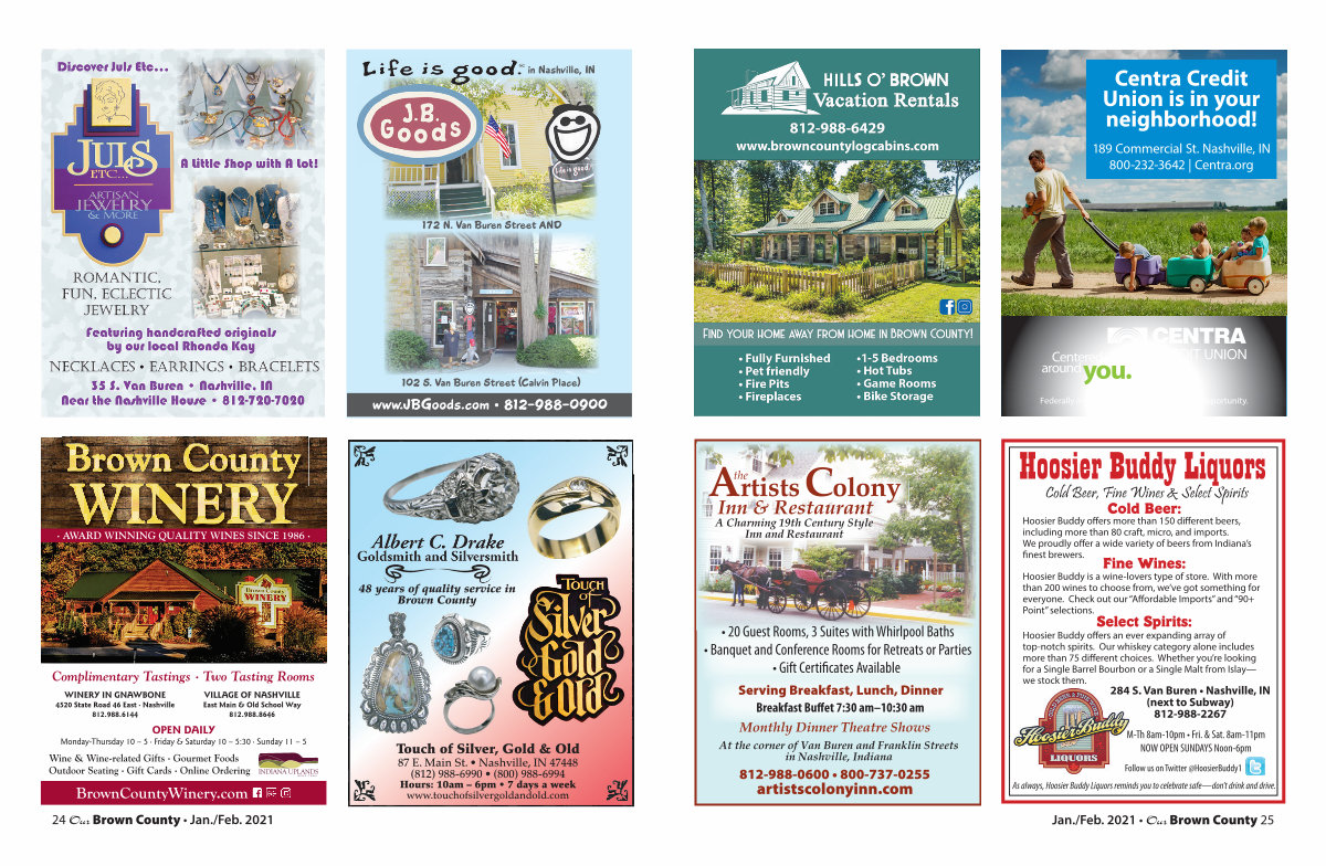 24 Our Brown County • Jan./ Feb. 2021 102 S. Van Buren Street( Calvin Place) 172 N. Van Buren Street AND in Nashville, IN www. JBGoods. com • 812-988-0900 48 years of quality service in Brown County Touch of Silver, Gold & Old 87 E. Main St. • Nashville, IN 47448( 812) 988-6990 •( 800) 988-6994 Hours: 10am – 6pm • 7 days a week www. touchofsilvergoldandold. com BrownCountyWinery. com Complimentary Tastings · Two Tasting Rooms WINERY IN GNAWBONE 4520 State Road 46 East · Nashville 812.988.6144 VILLAGE OF NASHVILLE East Main & Old School Way 812.988.8646 OPEN DAILY Monday-Thursday 10 – 5 · Friday & Saturday 10 – 5:30 · Sunday 11 – 5 Wine & Wine-related Gifts · Gourmet Foods Outdoor Seating · Gift Cards · Online Ordering Brown County Brown County Brown C Brown County Brown County Brown County Brown County Brown County Brown County Brown County Brown County Brown County Brown County Brown County Brown County Brown County Brown County Brown County Brown County Brown County Brown County Brown County Brown County Brown County Brown County Brown County Brown County Brown County Brown County Brown County Brown County Brown County Brown County Brown County Brown County Brown County Brown County Brown County Brown County Brown County Brown County Brown County Brown County Brown County Brown County Brown County Brown County Brown County Brown County Brown County Brown County Brown County Brown County Brown County Brown County Brown County Brown County Brown County Brown County Brown County Brown County Brown County Brown County Brown County Brown County Brown County Brown County Brown County Brown County Brown County Brown County Brown County Brown County Brown County Brown County Brown County Brown County Brown County Brown County Brown County Brown County Brown County Brown County Brown County Brown County Brown County Brown County Brown County Brown County Brown County Brown County Brown County Brown County Brown County Brown County Brown County Brown County Brown County Brown County Brown County Brown County Brown County Brown County Brown County Brown County Brown County Brown County Brown County Brown County Brown County Brown County Brown County Brown County Brown County Brown County Brown County Brown County Brown County Brown County Brown County Brown County Brown County Brown County Brown County Brown County Brown County Brown County Brown County Brown County Brown County Brown County Brown County Brown County Brown County Brown County Brown County Brown County Brown County Brown County Brown County Brown County Brown County Brown County Brown County Brown County Brown County Brown County Brown County Brown County Brown County Brown County Brown County Brown County Brown County Brown County Brown County Brown County Brown County Brown County Brown County Brown County Brown County Brown County Brown County Brown County Brown County Brown County Brown County Brown County Brown County Brown County Brown County Brown County Brown County Brown County Brown County Brown County Brown County Brown County Brown County Brown County Brown County Brown County Brown County Brown County Brown County Brown County Brown County Brown County Brown County Brown County Brown County Brown County Brown County Brown County Brown County Brown County Brown County Brown County Brown County Brown County Brown County Brown County Brown County Brown County Brown County Brown County Brown County Brown County Brown County Brown County Brown County Brown County Brown County Brown County Brown County Brown County Brown County Brown County Brown County Brown County Brown County Brown County Brown County Brown County Brown County Brown County Brown County Brown County Brown County Brown County Brown County Brown County Brown County Brown County Brown County Brown County Brown County Brown County Brown County Brown County Brown County Brown County Brown County Brown County Brown County Brown County Brown County Brown County Brown County Brown County Brown County Brown County Brown County Brown County Brown County Brown County Brown County Brown County Brown County Brown County Brown County Brown County Brown County Brown County Brown County Brown County Brown County Brown County Brown County Brown County Brown County Brown County Brown County Brown County Brown County Brown County Brown County Brown County Brown County Brown County Brown County Brown County Brown County Brown County Brown County Brown County Brown County Brown County Brown County Brown County Brown County Brown County Brown County Brown County Brown County Brown County Brown County Brown County Brown County Brown County Brown County Brown County Brown County Brown County Brown County Brown County Brown County Brown County Brown County Brown County Brown County Brown County Brown County Brown County Brown County Brown County Brown County Brown County Brown County Brown County Brown County Brown County Brown County Brown County Brown County Brown County Brown County Brown County Brown County Brown County Brown County Brown County Brown County Brown County Brown County Brown County Brown County Brown County Brown County Brown County Brown County Brown County Brown County Brown County Brown County Brown County Brown County Brown County Brown County Brown County Brown County Brown County Brown County Brown County Brown County Brown County Brown County Brown County Brown County Brown County Brown County Brown County Brown County Brown County Brown County Brown County Brown County Brown County Brown County Brown County Brown County Brown County Brown County Brown County Brown County Brown County Brown County Brown County Brown County Brown County Brown County Brown County Brown County Brown County Brown County Brown County Brown County Brown County Brown County Brown County Brown County Brown County Brown County Brown County Brown County Brown County Brown County Brown County Brown County Brown County Brown County Brown County Brown County 