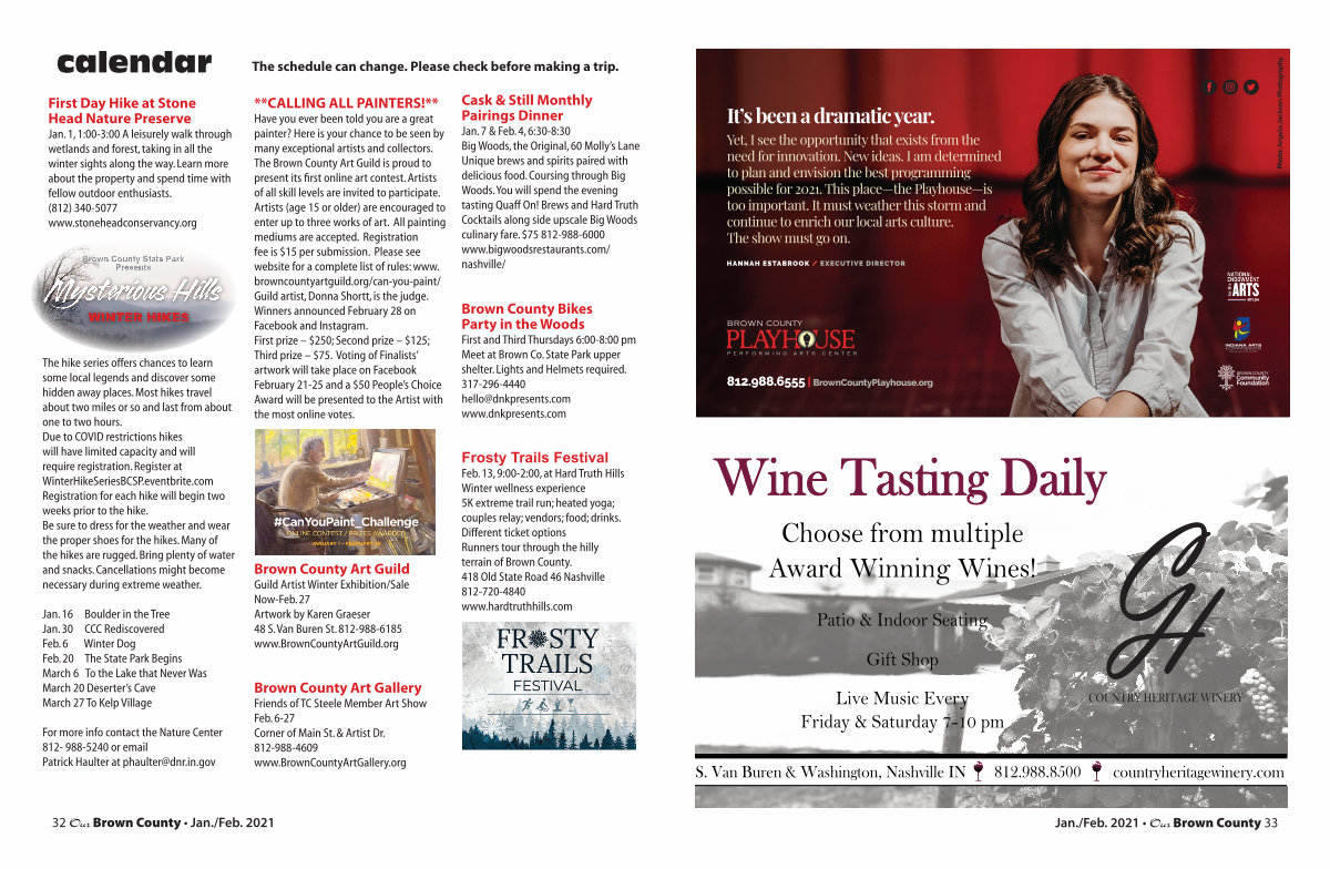 S. Van Buren & Washington, Nashville IN 812.988.8500 countryheritagewinery. com