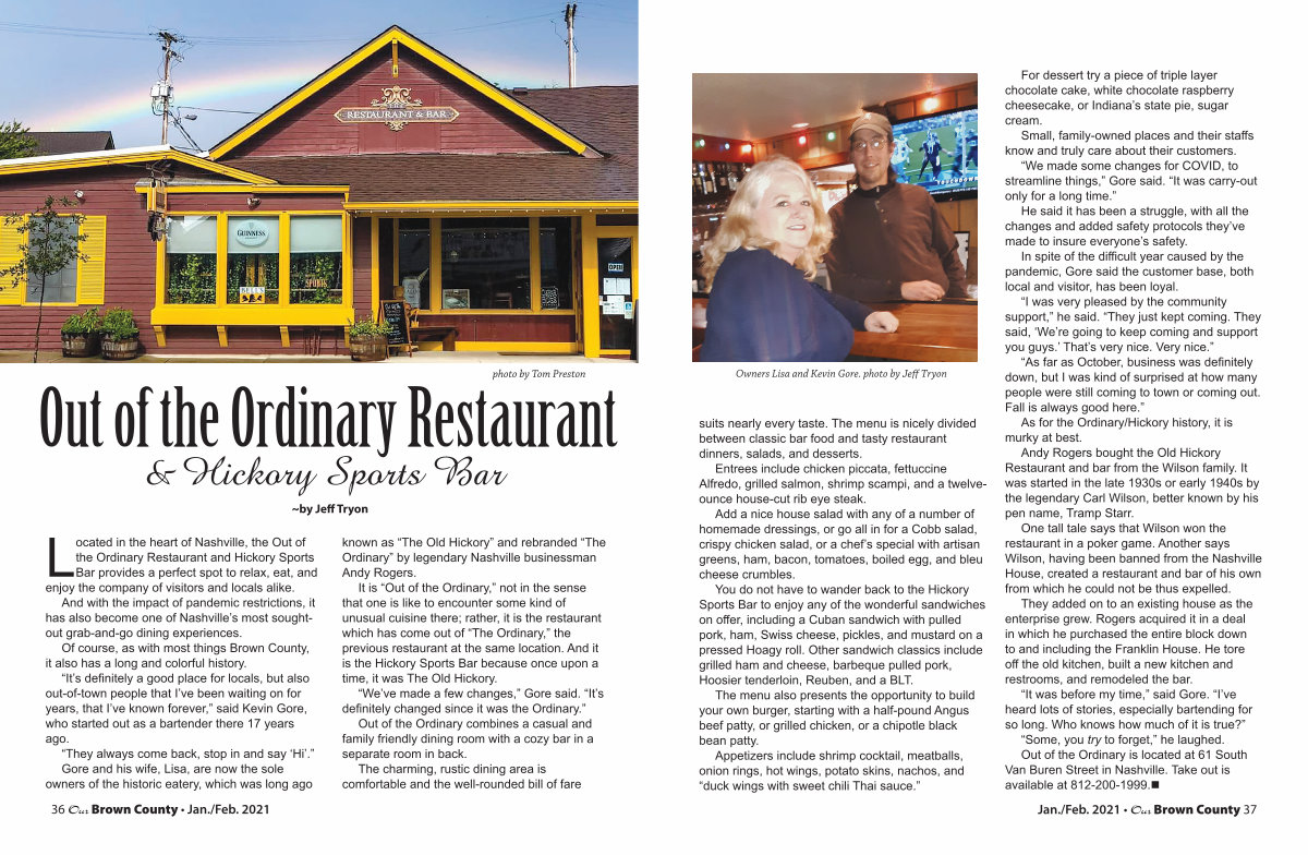 “ It was before my time,” said Gore.“ I’ ve heard lots of stories, especially bartending for so long. Who knows how much of it is true?”“ Some, you try to forget,” he laughed. Out of the Ordinary is located at 61 South Van Buren Street in Nashville. Take out is available at 812-200-1999.•