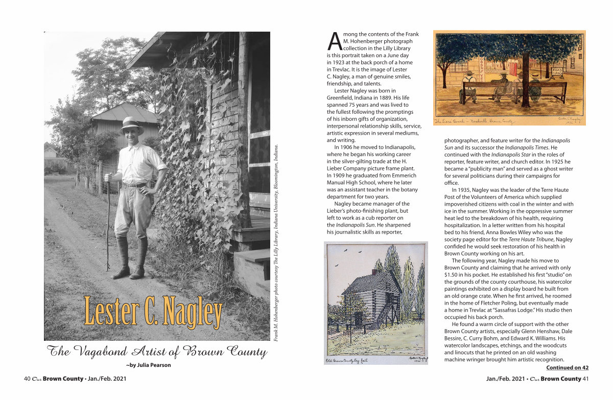 The following year, Nagley made his move to Brown County and claiming that he arrived with only $ 1.50 in his pocket. He established his first“ studio” on the grounds of the county courthouse, his watercolor paintings exhibited on a display board he built from an old orange crate. When he first arrived, he roomed in the home of Fletcher Poling, but eventually made a home in Trevlac at“ Sassafras Lodge.” His studio then occupied his back porch.