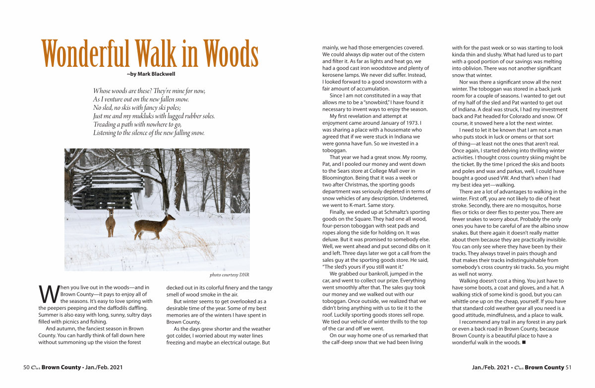 When you live out in the woods— and in Brown County— it pays to enjoy all of the seasons. It’ s easy to love spring with the peepers peeping and the daffodils daffling. Summer is also easy with long, sunny, sultry days filled with picnics and fishing.