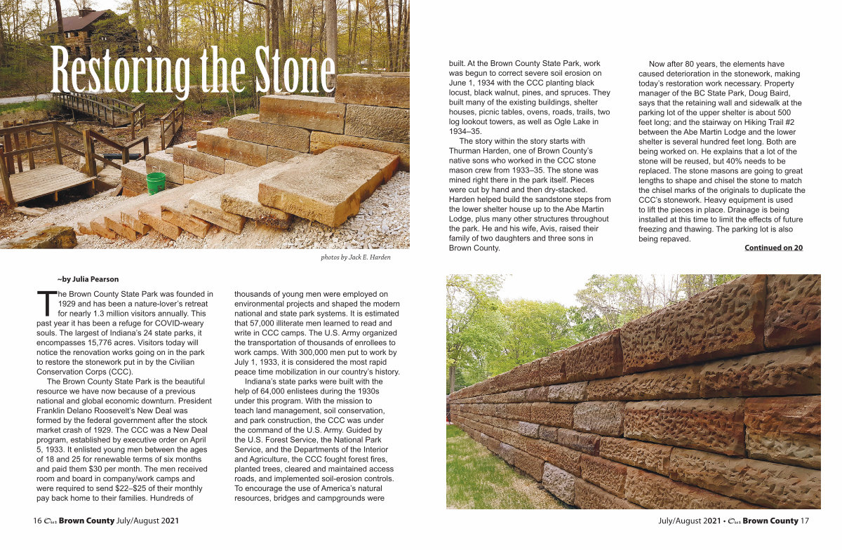 The Brown County State Park was founded in 1929 and has been a nature-lover’ s retreat for nearly 1.3 million visitors annually. This past year it has been a refuge for COVID-weary souls. The largest of Indiana’ s 24 state parks, it encompasses 15,776 acres. Visitors today will notice the renovation works going on in the park to restore the stonework put in by the Civilian Conservation Corps( CCC).