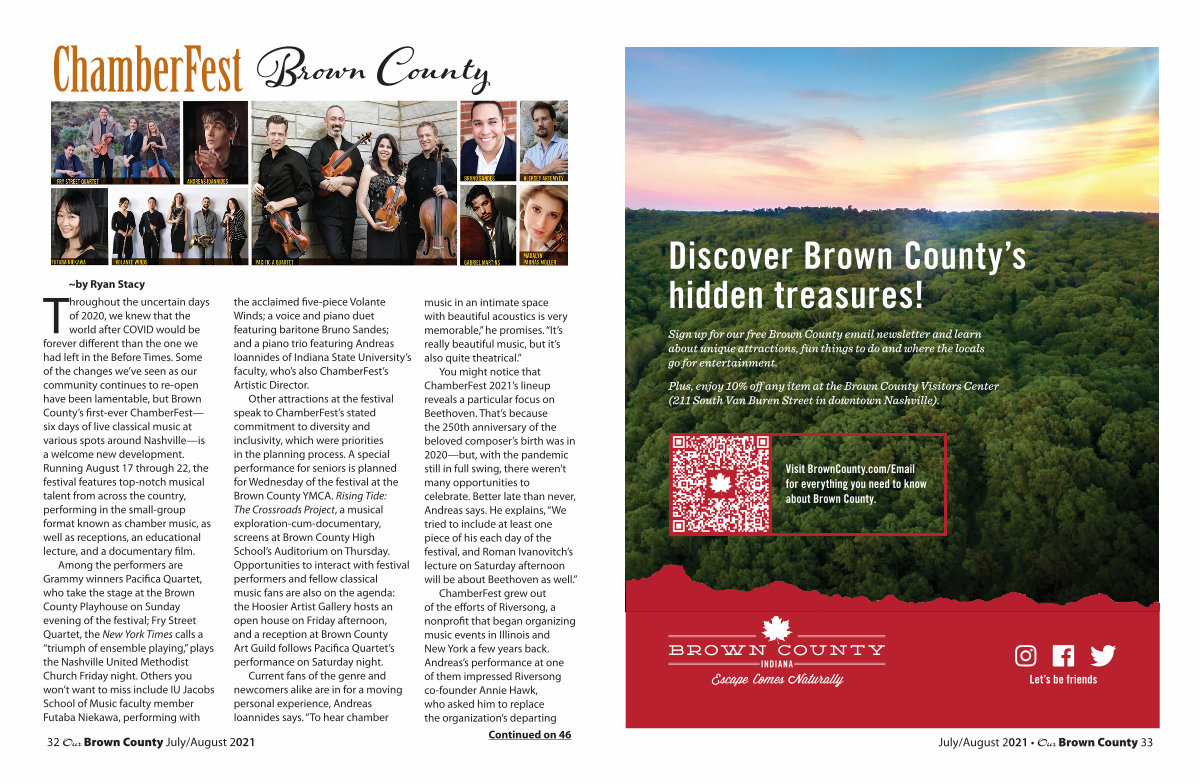 Throughout the uncertain days of 2020, we knew that the world after COVID would be forever different than the one we had left in the Before Times. Some of the changes we’ ve seen as our community continues to re-open have been lamentable, but Brown County’ s first-ever ChamberFest— six days of live classical music at various spots around Nashville— is a welcome new development. Running August 17 through 22, the festival features top-notch musical talent from across the country, performing in the small-group format known as chamber music, as well as receptions, an educational lecture, and a documentary film. Among the performers are Grammy winners Pacifica Quartet, who take the stage at the Brown County Playhouse on Sunday evening of the festival; Fry Street Quartet, the New York Times calls a“ triumph of ensemble playing,” plays the Nashville United Methodist Church Friday night. Others you won’ t want to miss include IU Jacobs School of Music faculty member Futaba Niekawa, performing with