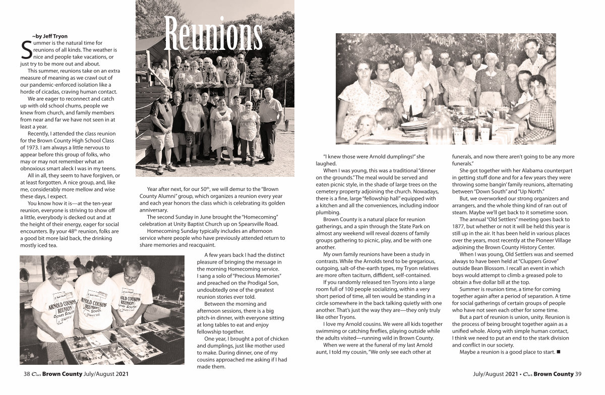 Brown County is a natural place for reunion gatherings, and a spin through the State Park on almost any weekend will reveal dozens of family groups gathering to picnic, play, and be with one another.