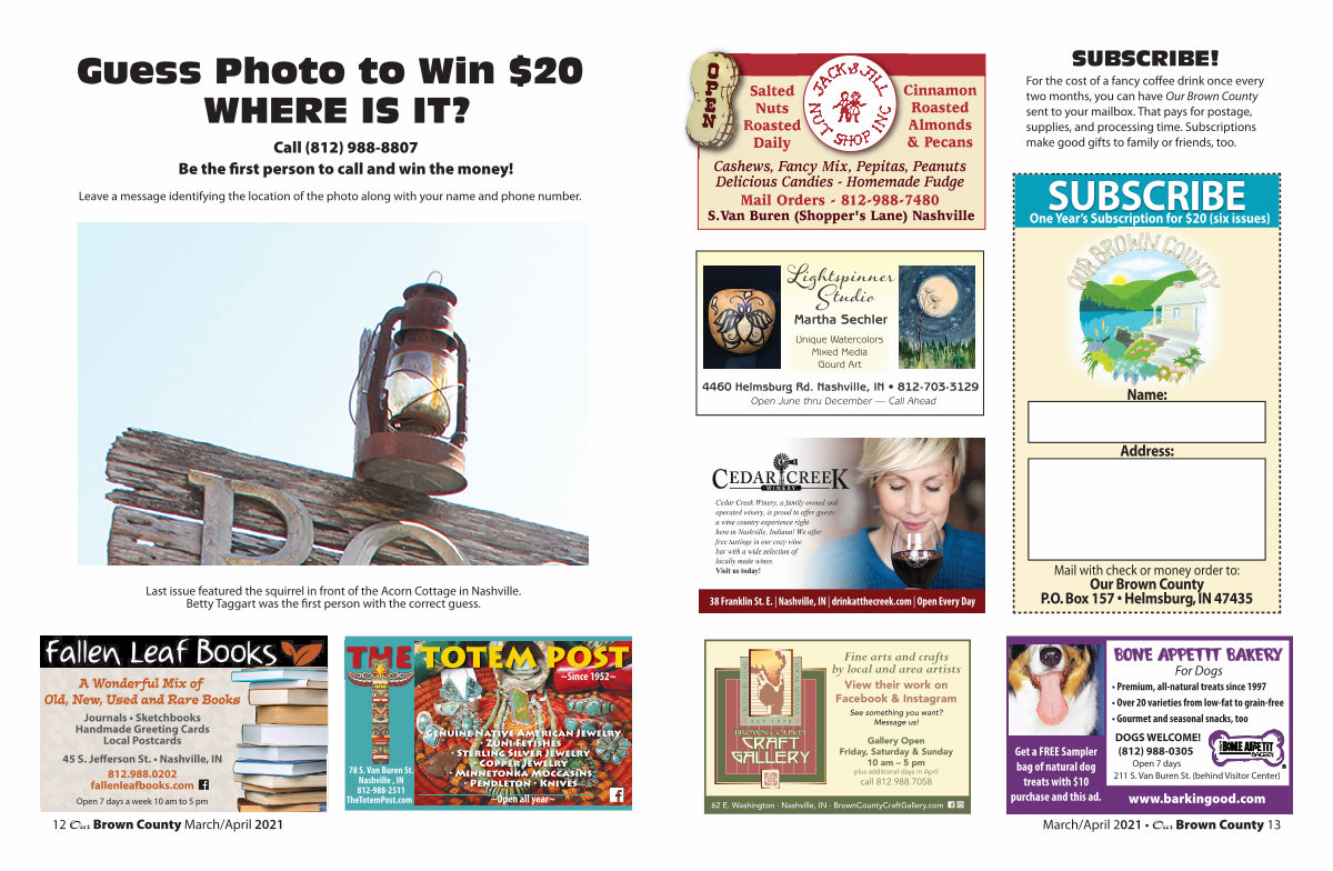 For the cost of a fancy coffee drink once every two months, you can have Our Brown County sent to your mailbox. That pays for postage, supplies, and processing time. Subscriptions make good gifts to family or friends, too.