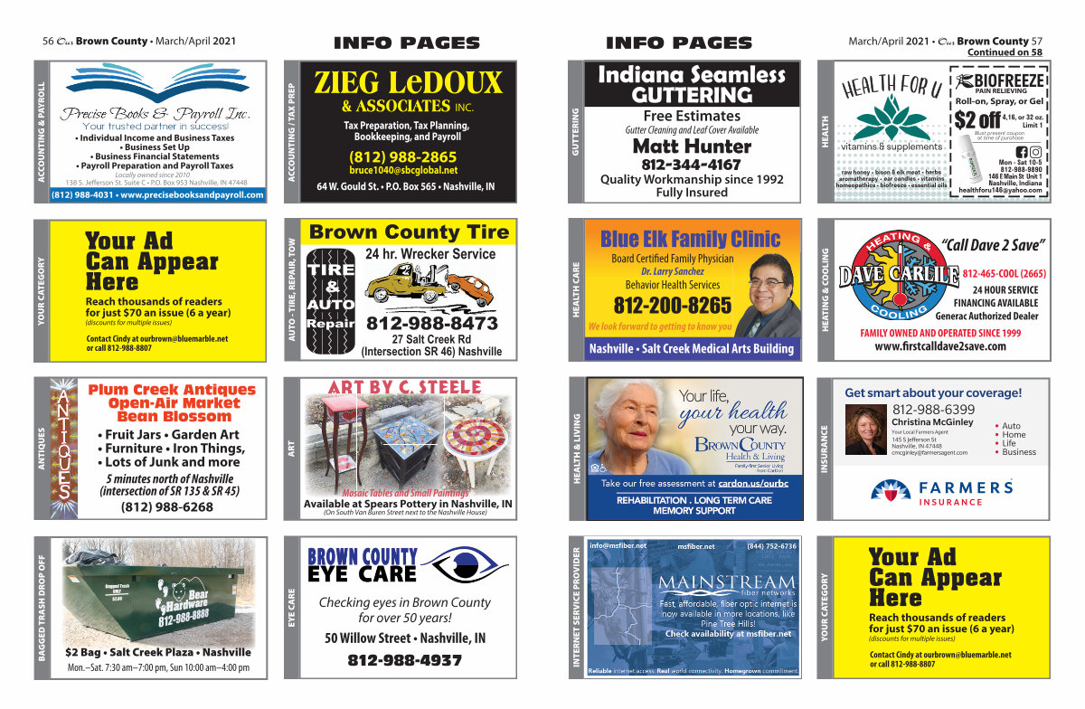 • Payroll Preparation and Payroll Taxes Locally owned since 2010 138 S. Jefferson St. Suite C • P. O. Box 953 Nashville, IN 47448