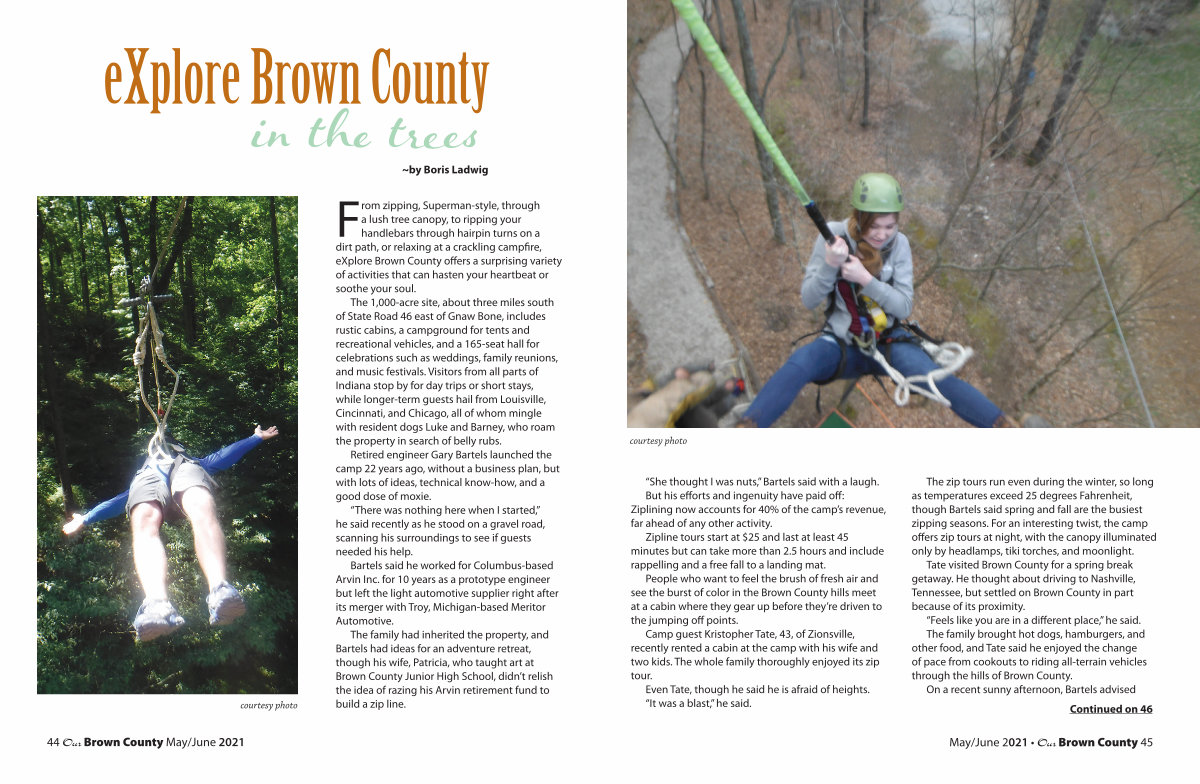 The family had inherited the property, and Bartels had ideas for an adventure retreat, though his wife, Patricia, who taught art at Brown County Junior High School, didn’t relish the idea of razing his Arvin retirement fund to build a zip line.