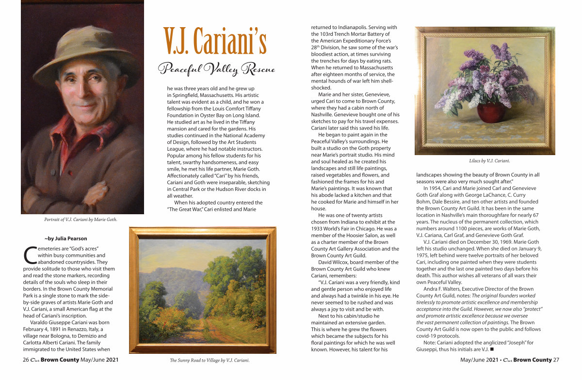 Marie and her sister, Genevieve, urged Cari to come to Brown County, where they had a cabin north of Nashville. Genevieve bought one of his sketches to pay for his travel expenses. Cariani later said this saved his life.