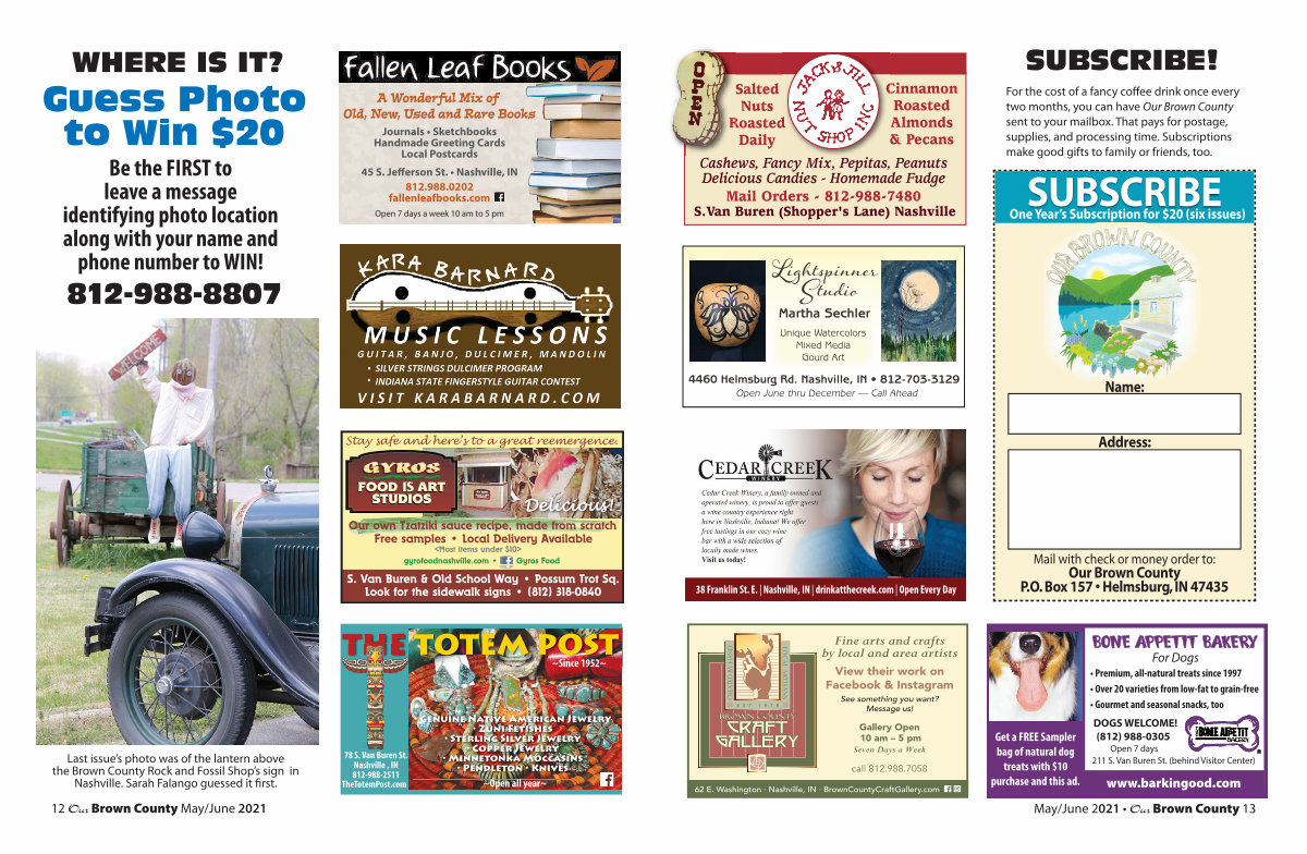 For the cost of a fancy coffee drink once every two months, you can have Our Brown County sent to your mailbox. That pays for postage, supplies, and processing time. Subscriptions make good gifts to family or friends, too.