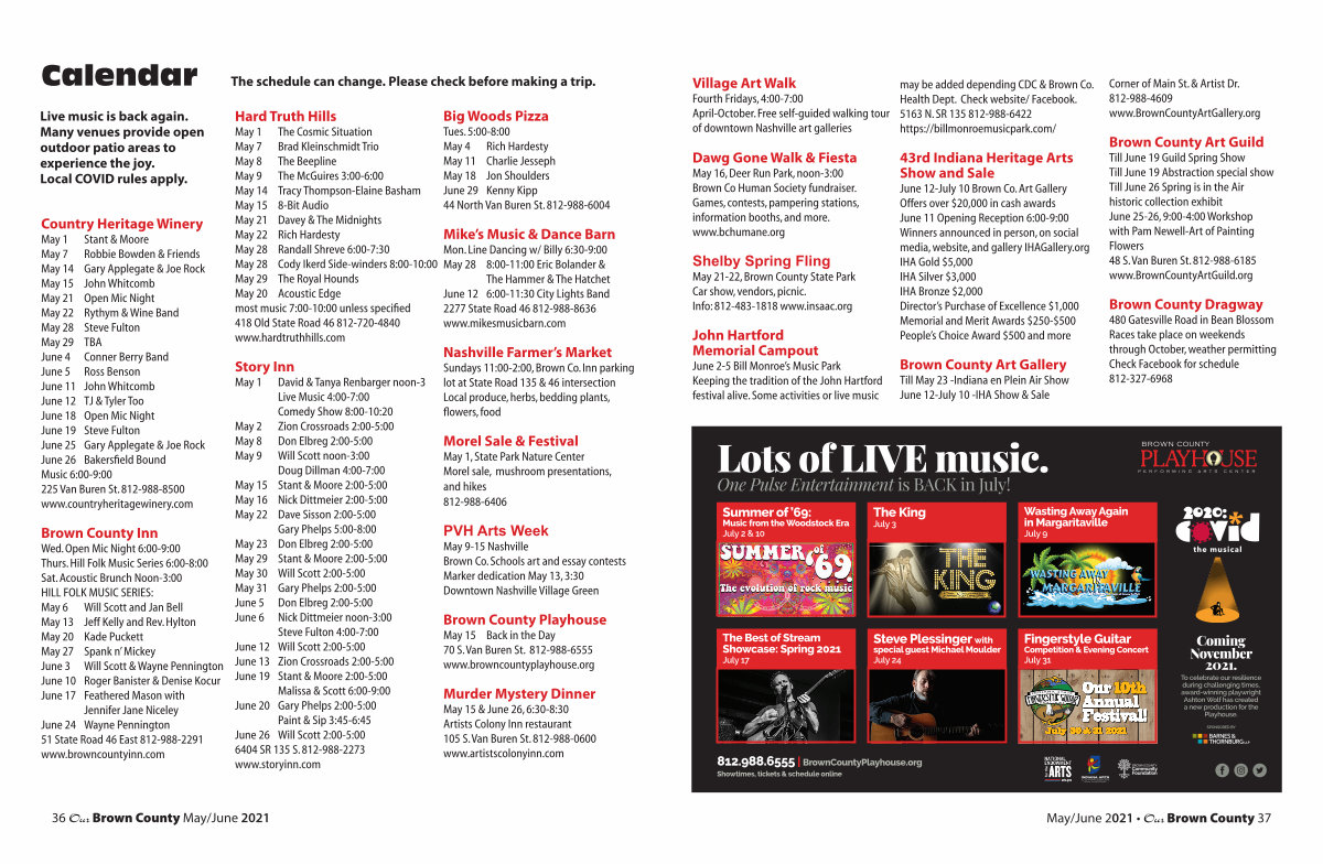 may be added depending CDC & Brown Co. Health Dept. Check website / Facebook. 5163 N. SR 135 812-988-6422 https:// billmonroemusicpark. com /