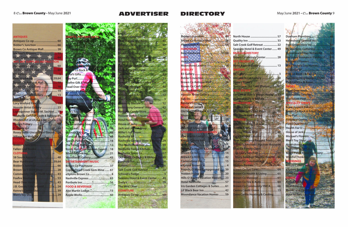 Bidder’ s Junction.............................. 66 Brown Co Antique Mall.................... 28 Plum Creek Antiques....................... 64 HARDWARE Bear Hardware............................. 59,64 HATS Head Over Heels............................... 43 Moonshine Leather.......................... 18 JEWELRY B3 Gallery............................................. 3 Bidder’ s Junction.............................. 66 Brown Co Antique Mall.................... 28 Brown Co Craft Gallery.................... 13 Foxfire Boutique............................... 53 Hoosier Artist Gallery...................... 23 Juls Etc................................................ 24 Kenne’ s Corner Stop......................... 39 New Leaf............................................. 19 Old McDurbin Gold & Gifts............. 21 Rhonda Kay’ s..................................... 48 Spears Pottery................................... 18 The Totem Post.................................. 12 Touch of Silver Gold & Old.............. 24 LODGING / CAMPGROUNDS Abe Martin Lodge............................. 15 Artists Colony Inn............................. 25 Brick Lodge........................................ 57 Brown Co Health & Living............... 65 Brown Co Inn..................................... 14 Brown Co KOA................................... 42 Cornerstone Inn................................ 15 eXplore Brown Co............................... 4 Friends O’ Mine Campground........ 39 Hidden Valley Inn............................. 20 Hills O’ Brown Vacation Rentals..... 23 Hotel Nashville.................................. 57 Iris Garden Cottages & Suites......... 61 Lil’ Black Bear Inn.............................. 42 Moondance Vacation Homes......... 59