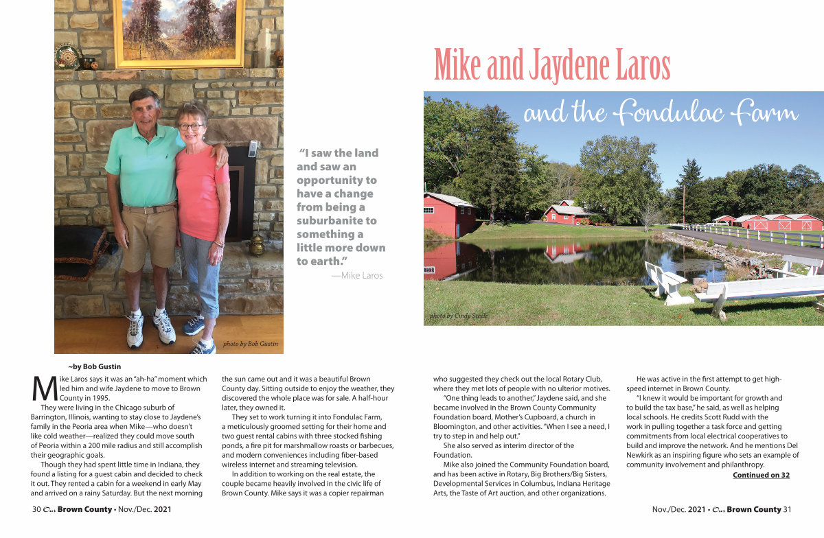 “ One thing leads to another,” Jaydene said, and she became involved in the Brown County Community Foundation board, Mother’ s Cupboard, a church in Bloomington, and other activities.“ When I see a need, I try to step in and help out.”