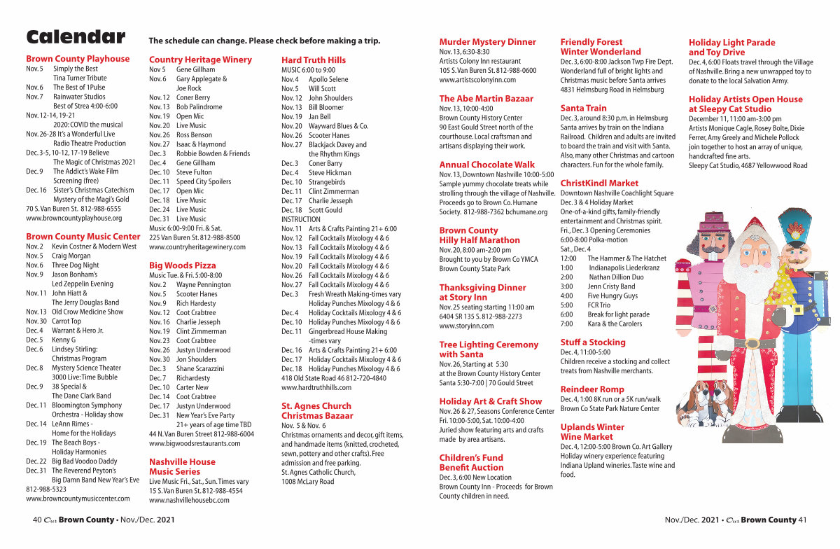 Nov. 13, Downtown Nashville 10:00-5:00 Sample yummy chocolate treats while strolling through the village of Nashville. Proceeds go to Brown Co. Humane Society. 812-988-7362 bchumane. org