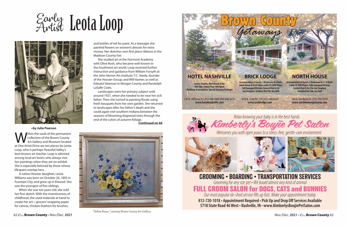 62 Our Brown County • Nov./ Dec. 2021 and bottles of ink for paint. As a teenager she painted flowers on women’ s dresses for extra money. Her sketches won first place ribbons in the Madison County Fair.
