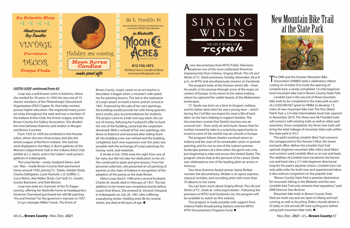 The Loop family— Leota, husband Glenn, and son Max— made Brown County their permanent home around 1930, joining T. C. Steele, Adolph Shulz, Charles Dahlgreen, Lucie Hartrath, L. O. Griffith, C. Curry Bohm, Ada Walter Shulz, Carl Graf, V. J. Cariani, Gustav Baumann, and Dale Bessire.