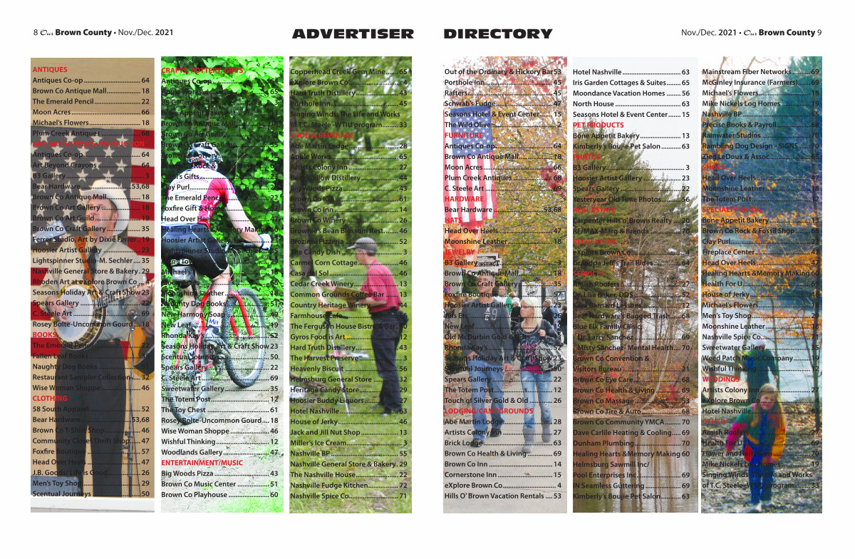 CRAFTS, POTTERY, GIFTS Antiques Co-op................................. 64 Apple Works....................................... 65 B3 Gallery............................................. 3 Bone Appetit Bakery........................ 13 Brown Co Antique Mall.................... 18 Brown Co Art Guild........................... 19 Brown Co Craft Gallery.................... 35 Brown Co Pottery.............................. 12 Brown Co Rock & Fossil Shop......... 65 Carol’ s Gifts........................................ 23 Clay Purl............................................. 23 The Emerald Pencil........................... 22 Foxfire Gift & Home.......................... 57 Head Over Heels............................... 47 Healing Hearts & Memory Making. 60 Hoosier Artist Gallery...................... 23 Lightspinner Studio-M. Sechler..... 35 Men’ s Toy Shop.................................. 29 Michael’ s Flowers.............................. 18 Moon Acres........................................ 66 Moonshine Leather.......................... 18 Naughty Dog Books......................... 51 New Harmony Soap......................... 49 New Leaf............................................. 19 Rhonda Kay’ s..................................... 52 Seasons Holiday Art & Craft Show. 23 Scentual Journeys............................ 50 Spears Gallery................................... 22 C. Steele Art....................................... 69 Sweetwater Gallery.......................... 35 The Totem Post.................................. 12 The Toy Chest.................................... 61 Rosey Bolte-Uncommon Gourd..... 18 Wise Woman Shoppe....................... 46 Wishful Thinking............................... 12 Woodlands Gallery........................... 47 ENTERTAINMENT / MUSIC Big Woods Pizza................................ 43 Brown Co Music Center................... 51 Brown Co Playhouse........................ 60