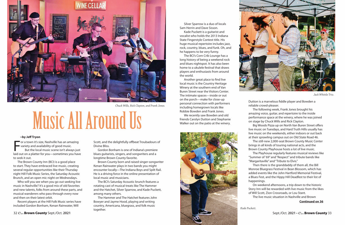 The still-new 2,000-seat Brown County Music Center brings in all kinds of touring national acts, and the Brown County Playhouse hosts a lot of live music.