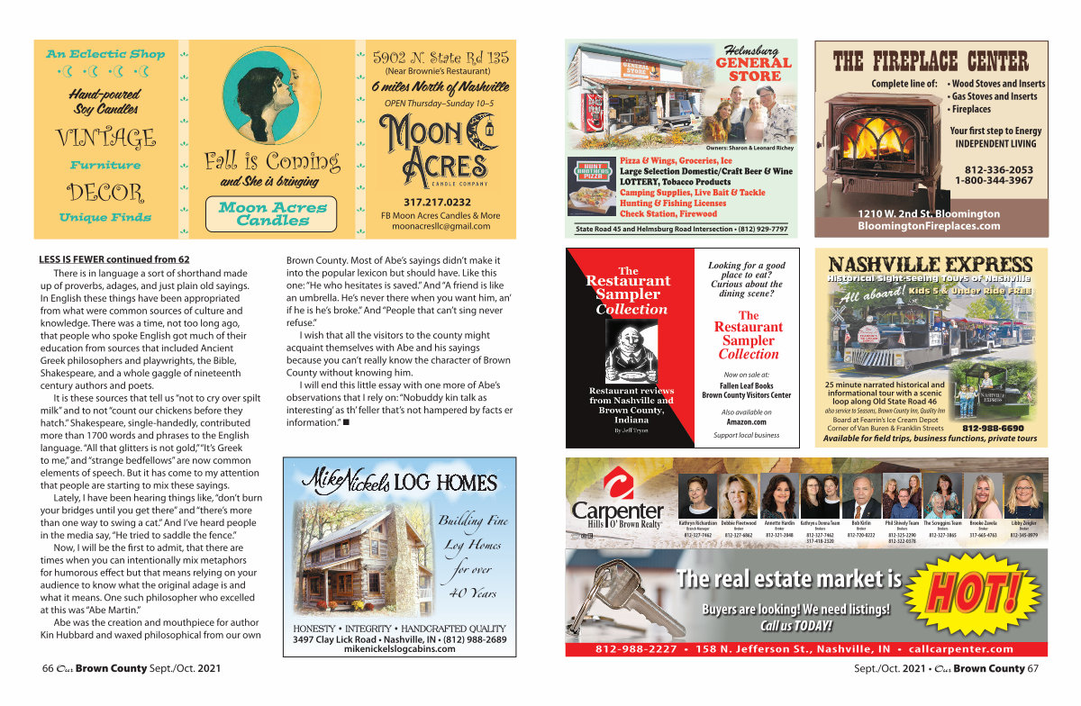 Sept./ Oct. 2021 • Our Brown County 67 All aboard! Ki Ki Ki Ki Ki Ki Ki Ki Ki Ki Ki Ki Ki Kids ds ds ds ds ds ds ds ds ds ds ds ds ds ds ds ds ds ds 5 & Und nd nd nd nd nd nd nd nd nder er er er er er er er er er er er er er er er er er er er er er er er er er er Rid id id id id id id id id id id id id id id id id id id id id id id id id id id id id id id id id id id id id id id id id id id id id id id id id id id id id id id id id id id id id id id id id id id id id id id id id id id id id id id id id id id ide FR FR FR FR FR FR FR FR FR FR FR FR FR FR FR FR FR FR FR FR FR FREE EE EE EE EE EE EE EE EE EE EE EE EE EE EE EE EE EE EE EE EE EE EE EE EE EE EE EE EE EE EE EE EE EE EE EE EE EE EE EE EE EE EE EE E Kids 5 & Under Ride FREE Board at Fearrin’ s Ice Cream Depot Corner of Van Buren & Franklin Streets 25 minute narrated historical and informational tour with a scenic loop along Old State Road 46 Available for field trips, business functions, private tours 812-988-6690 Hi Hi Hi Hi Hi Hi Hi Hi Hi Hi Hi Hi t st st st st st st st st st st st st st st st st st st st st st st st st st st st st st st st st st st st st st st st st st st st st st st st st st st st st st st st st st st st st st st st st st st st st st st st st st st st st st st st st st st st st st st st st st st st s or or or or or or or or or or or or or or or or or or or or or or or or or or or or or or or or or or or or or or or or or or or or or or or or or or or or or or or or or or or or or or or or or or or or or or or or or or or or or or or or or or or o ic ic ic ic ic ic ic ic ic ic ic ic ic ic ic ic ic ic ic ic ic ic ic ic ic ic ic ical al al al al al al al al al al al al al al al al al al al al al al al al al al al al al al al al al al al al al al al al al al al al al al al al al al al al al Sig ig ig ig ig ig ig ig ig ig ig ig ig ig ig ig ig ig ig ig ig ig ig ig ig ig ig ig ig ig ig ig ig ig ig ig ig ig ig ight ht ht ht ht ht ht ht ht ht ht ht ht ht ht ht ht ht ht ht ht ht ht ht ht ht ht ht ht ht ht ht ht ht ht ht ht ht ht ht ht ht ht ht ht ht ht ht ht ht ht ht ht ht ht ht ht ht ht ht ht ht h s-s-s-s-s-s-s-s-s-s-s-s-s-s-s-s-s-s-s-s-s-s-s-s-s-s-s-s-s-s-s-s-s-s-s-s-s-s-s-s-s-s-s-s-s-see ee ee ee ee ee ee ee ee ee ee ee ee ee ee ee ee ee ee ee ee ee ee ee ee ee ee ee ee ee ee ee ee ee ee ee ee ee ee ee ee ee ee ee ee ee ee ee ee ee ee ee ee ee ee ee ee ee ee ee ee ee ee ee ee ee ee ee ee eein in in in in in in in in in in in in in in in in in in in in in in in in in in in in in in in in in in in in in in in in in in in in in in in in in in in in in in in in in in in in in in in in in in in in in in in in in in in ing To To To To To To To To To To To To To To To To To To To To To To To To To To To To To To To To To To To To To To To To To To To To To To To To To To To To To To To To To To To To To To To To To To To To To To To To To To To To To To To To To To To T ur ur ur ur ur ur ur ur ur ur ur ur ur ur ur ur ur ur ur ur ur ur ur ur ur ur ur ur ur ur ur ur ur ur ur ur ur ur ur ur ur ur ur ur ur ur ur ur ur ur ur ur ur ur ur ur ur ur ur ur ur u s of of of of of of of of of of of of of of of of of of of of of of of of of of of of of of of of of of of Nas as as as as as as as as as as as as as as as as as as as as as as as as as as as as as ashv hv hv hv hv hv hv hv hv hv hv hv hv hv hv hv hv hv hv hv hv hv hv hv hv hv hv hv hv hv hv hv hv hv hv hv hv hv hv hv hv hv hv hv hv hv hv hv hv hv hv hv hv hv hv hv hv hv hv hv hv hv hv hv hv hv hv h il il il il il il il il il il il il il il il il il il il il il il ille le le le le le le le le le le le le le le le le le le Historical Sight-seeing Tours of Nashville also service to Seasons, Brown County Inn, Quality Inn NASHVILLE EXPRESS NASHVILLE EXPRESS Looking for a good place to eat? Curious about the dining scene? Now on sale at: Fallen Leaf Books Brown County Visitors Center Amazon. com Support local business The Restaurant Sampler Collection Also available on Kathryn Richardson Branch Manager 812-327-7462 Debbie Fleetwood Broker 812-327-6862 Kathryn & Donna Team Brokers 812-327-7462 317-418-2320 Bob Kirlin Broker 812-720-0222 Phil Shively Team Brokers 812-325-2290 812-322-0378 Annette Hardin Broker 812-321-2048 The Scroggins Team Brokers 812-327-3865 Brooke Zavela Broker 317-665-4763 O’ Brown Realty Hills HOT! HOT! 812-988-2227 • 158 N. Jefferson St., Nashville, IN • callcarpenter. com The real estate market is Buyers are looking! We need listings! Call us TODAY! Libby Zeigler Broker 812-345-8979 THE FIREPLACE CENTER 812-336-2053 1-800-344-3967 BloomingtonFireplaces. com • Wood Stoves and Inserts • Gas Stoves and Inserts • Fireplaces Your first step to Energy INDEPENDENT LIVING Complete line of: 1210 W. 2nd St. Bloomington Pizza & Wings, Groceries, Ice Large Selection Domestic / Craft Beer & Wine LOTTERY, Tobacco Products Camping Supplies, Live Bait & Tackle Hunting & Fishing Licenses Check Station, Firewood State Road 45 and Helmsburg Road Intersection •( 812) 929-7797 Owners: Sharon & Leonard Richey Helmsburg GENERAL STORE