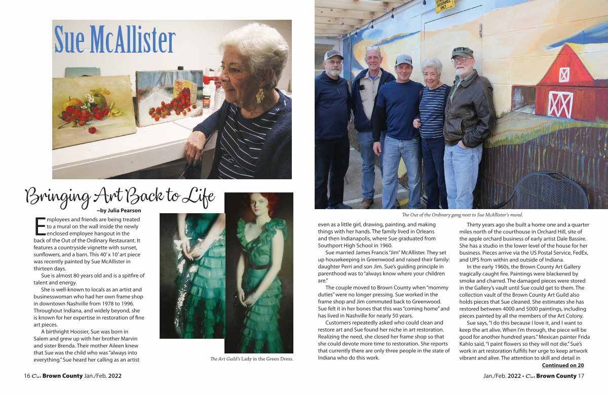 The couple moved to Brown County when“ mommy duties” were no longer pressing. Sue worked in the frame shop and Jim commuted back to Greenwood. Sue felt it in her bones that this was“ coming home” and has lived in Nashville for nearly 50 years.