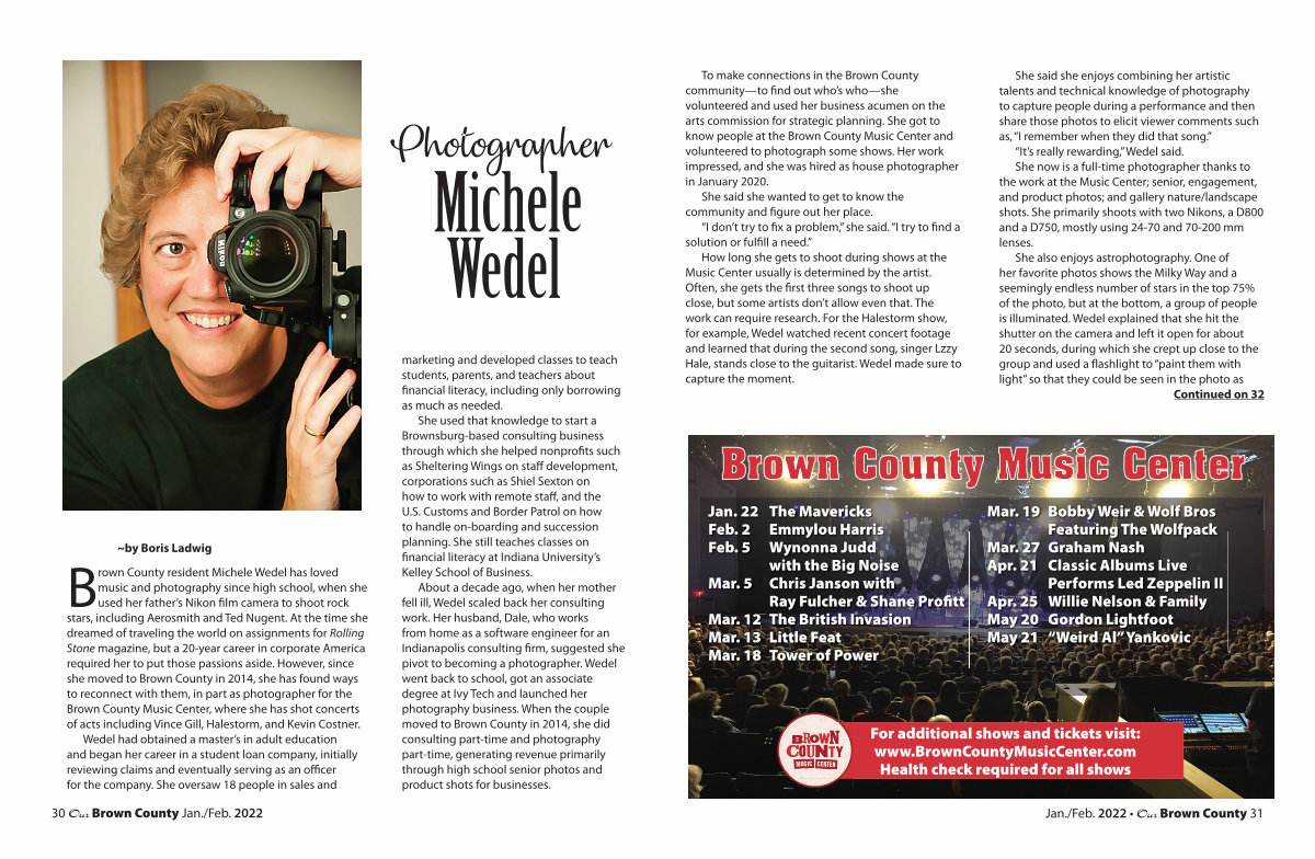 To make connections in the Brown County community— to find out who’ s who— she volunteered and used her business acumen on the arts commission for strategic planning. She got to know people at the Brown County Music Center and volunteered to photograph some shows. Her work impressed, and she was hired as house photographer in January 2020.