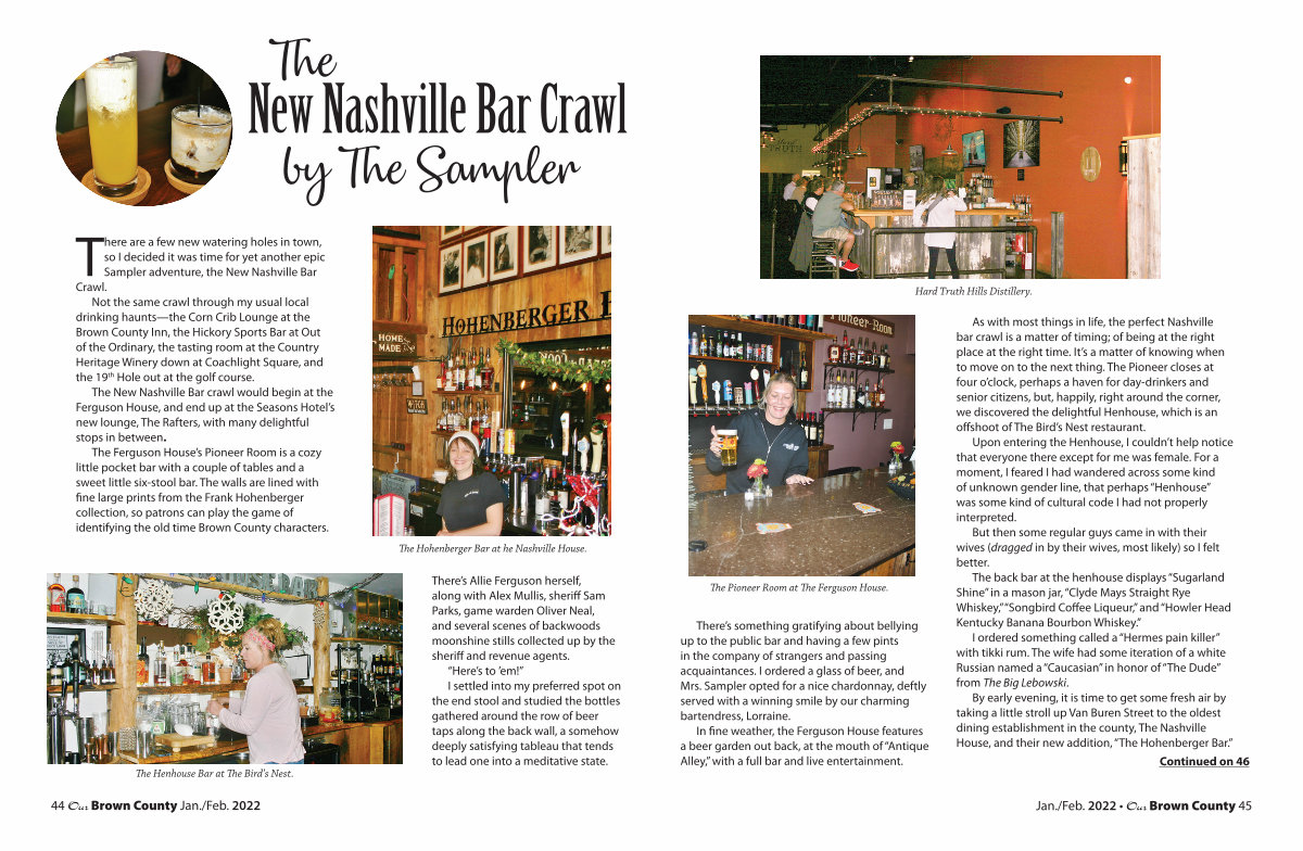 Not the same crawl through my usual local drinking haunts— the Corn Crib Lounge at the Brown County Inn, the Hickory Sports Bar at Out of the Ordinary, the tasting room at the Country Heritage Winery down at Coachlight Square, and the 19 th Hole out at the golf course.