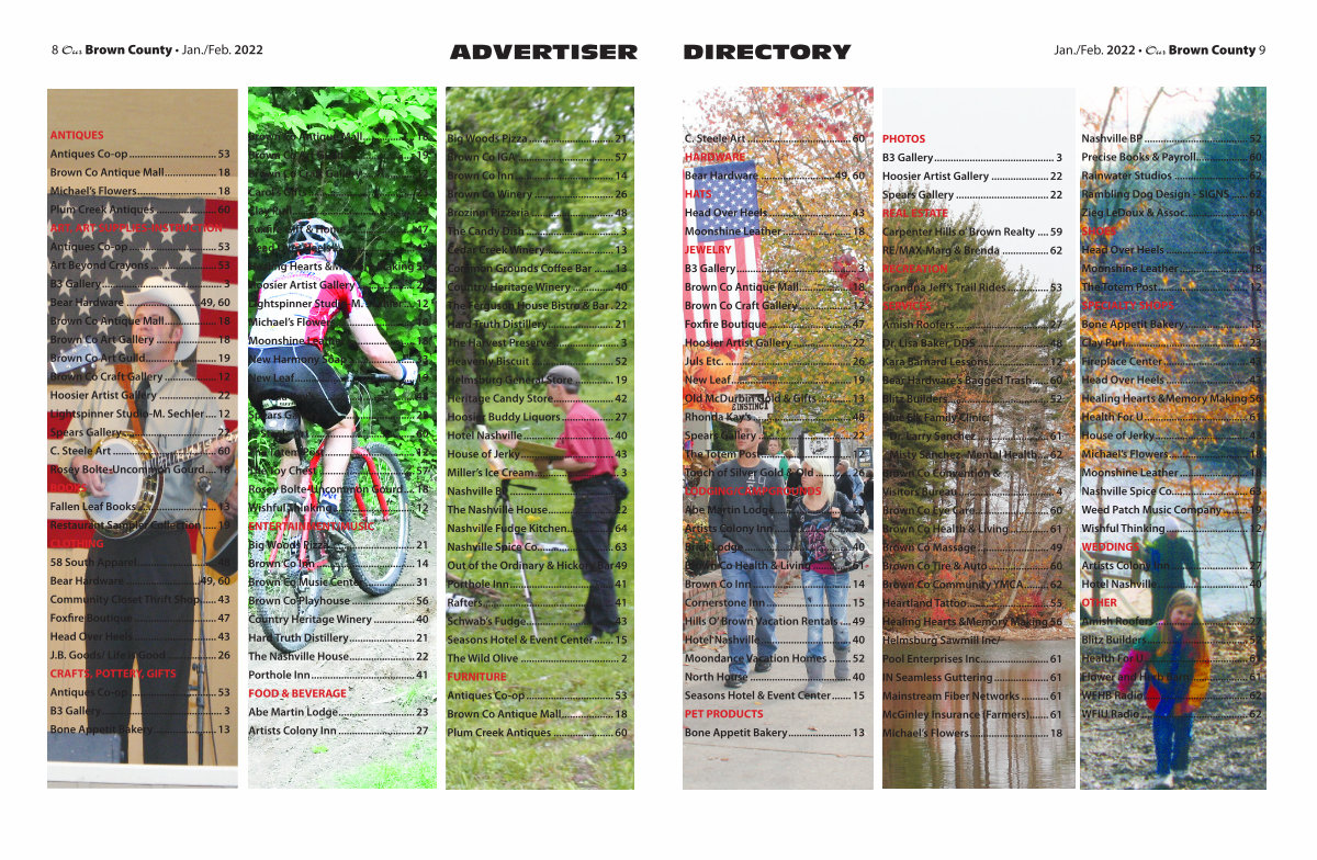 PHOTOS B3 Gallery............................................. 3 Hoosier Artist Gallery...................... 22 Spears Gallery................................... 22 REAL ESTATE Carpenter Hills o’ Brown Realty..... 59 RE / MAX-Marg & Brenda.................. 62 RECREATION Grandpa Jeff’ s Trail Rides................ 53 SERVICES Amish Roofers................................... 27 Dr. Lisa Baker, DDS........................... 48 Kara Barnard Lessons....................... 12 Bear Hardware’ s Bagged Trash....... 60 Blitz Builders...................................... 52 Blue Elk Family Clinic: Dr. Larry Sanchez........................... 61 Misty Sanchez- Mental Health..... 62 Brown Co Convention & Visitors Bureau.................................... 4 Brown Co Eye Care............................ 60 Brown Co Health & Living............... 61 Brown Co Massage........................... 49 Brown Co Tire & Auto....................... 60 Brown Co Community YMCA.......... 62 Heartland Tattoo............................... 55 Healing Hearts & Memory Making. 56 Helmsburg Sawmill Inc / Pool Enterprises Inc.......................... 61 IN Seamless Guttering..................... 61 Mainstream Fiber Networks........... 61 McGinley Insurance( Farmers)........ 61 Michael’ s Flowers.............................. 18