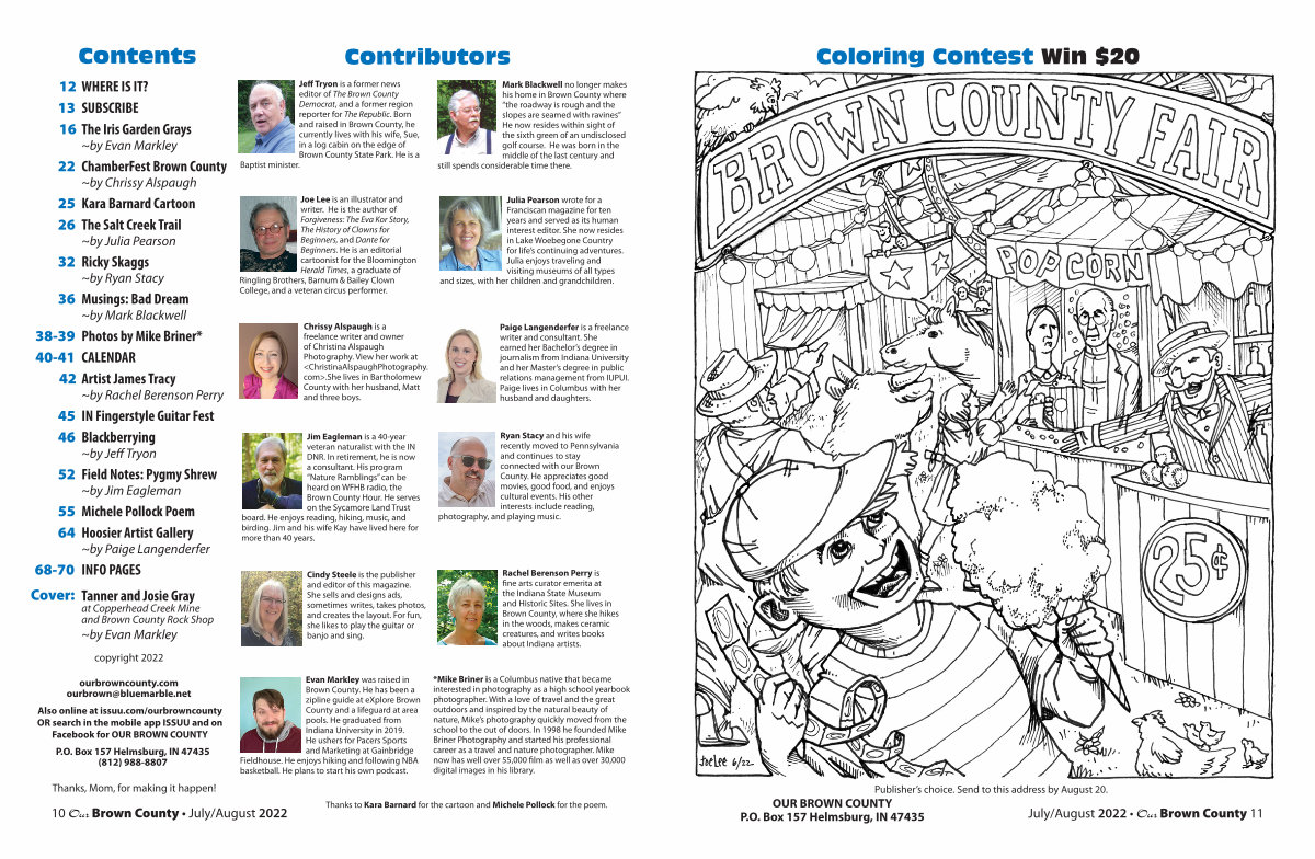 Rachel Berenson Perry is fine arts curator emerita at the Indiana State Museum and Historic Sites. She lives in Brown County, where she hikes in the woods, makes ceramic creatures, and writes books about Indiana artists. ourbrowncounty. com ourbrown @ bluemarble. net