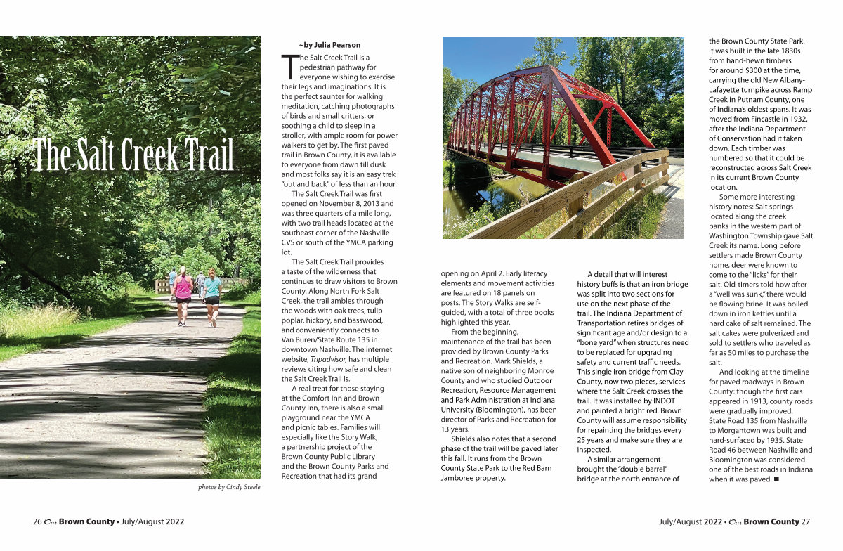 A detail that will interest history buffs is that an iron bridge was split into two sections for use on the next phase of the trail. The Indiana Department of Transportation retires bridges of significant age and / or design to a“ bone yard” when structures need to be replaced for upgrading safety and current traffic needs. This single iron bridge from Clay County, now two pieces, services where the Salt Creek crosses the trail. It was installed by INDOT and painted a bright red. Brown County will assume responsibility for repainting the bridges every 25 years and make sure they are inspected.