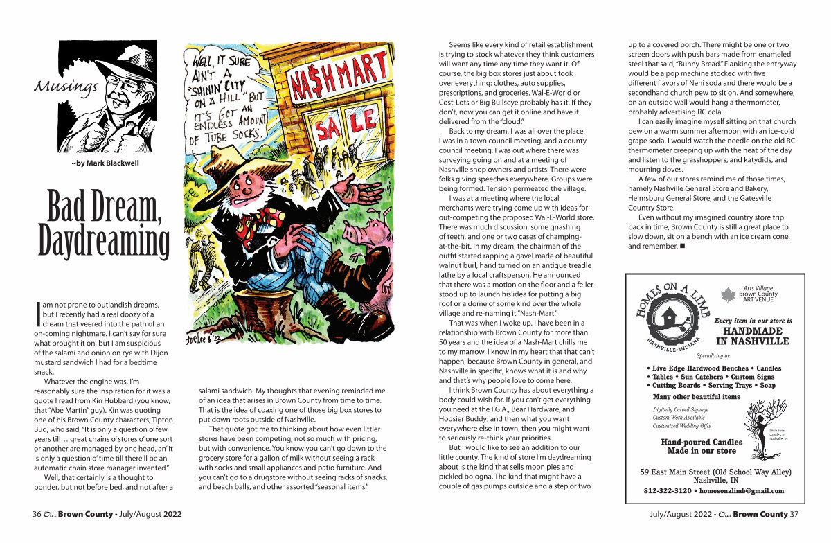 That was when I woke up. I have been in a relationship with Brown County for more than 50 years and the idea of a Nash-Mart chills me to my marrow. I know in my heart that that can’ t happen, because Brown County in general, and Nashville in specific, knows what it is and why and that’ s why people love to come here.
