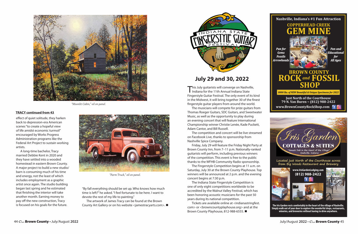 The artwork of James Tracy can be found at the Brown County Art Gallery or on his website < jamestracyarts. com >. •