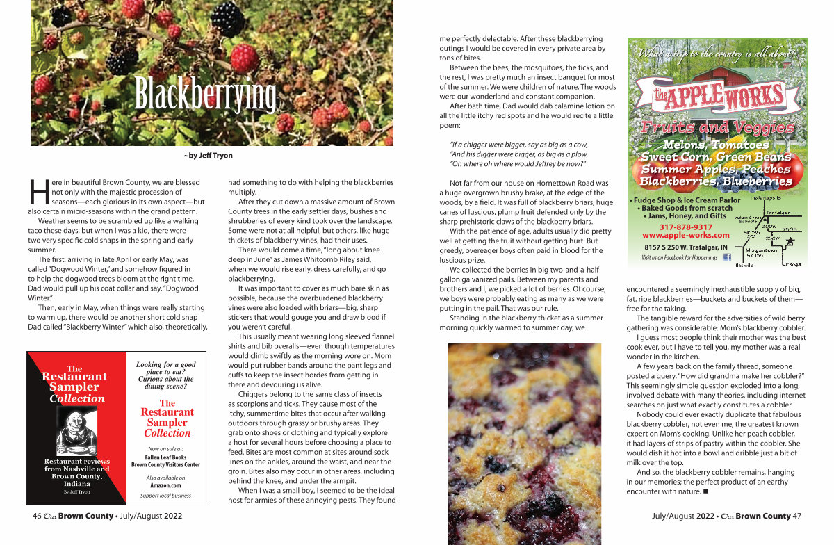 After they cut down a massive amount of Brown County trees in the early settler days, bushes and shrubberies of every kind took over the landscape. Some were not at all helpful, but others, like huge thickets of blackberry vines, had their uses.