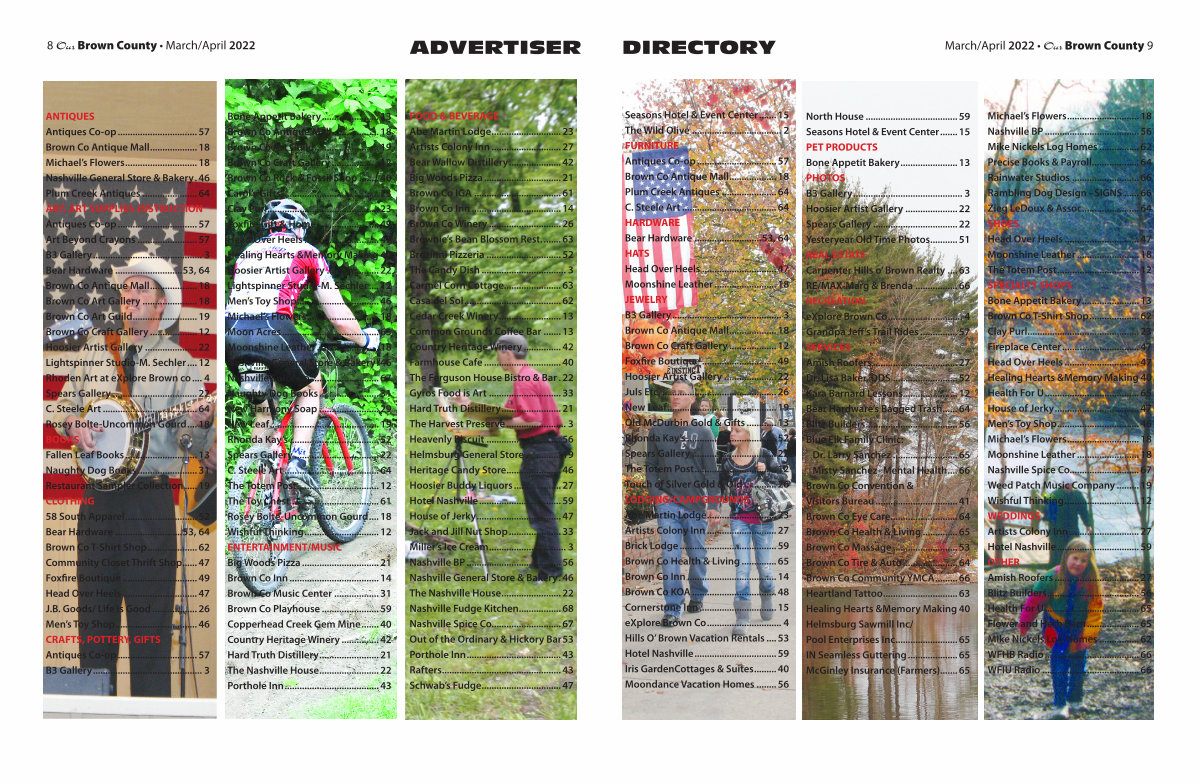 ANTIQUES Antiques Co-op................................. 57 Brown Co Antique Mall.................... 18 Michael’ s Flowers.............................. 18 Nashville General Store & Bakery.. 46 Plum Creek Antiques....................... 64 ART, ART SUPPLIES-INSTRUCTION Antiques Co-op................................. 57 Art Beyond Crayons......................... 57 B3 Gallery............................................. 3 Bear Hardware............................ 53, 64 Brown Co Antique Mall.................... 18 Brown Co Art Gallery....................... 18 Brown Co Art Guild........................... 19 Brown Co Craft Gallery.................... 12 Hoosier Artist Gallery...................... 22 Lightspinner Studio-M. Sechler..... 12 Rhoden Art at eXplore Brown co..... 4 Spears Gallery................................... 22 C. Steele Art....................................... 64 Rosey Bolte-Uncommon Gourd..... 18 BOOKS Fallen Leaf Books.............................. 13 Naughty Dog Books......................... 31 Restaurant Sampler Collection...... 19 CLOTHING 58 South Apparel.............................. 52 Bear Hardware............................ 53, 64 Brown Co T-Shirt Shop..................... 62 Community Closet Thrift Shop....... 47 Foxfire Boutique............................... 49 Head Over Heels............................... 47 J. B. Goods / Life is Good................... 26 Men’ s Toy Shop.................................. 46 CRAFTS, POTTERY, GIFTS Antiques Co-op................................. 57 B3 Gallery............................................. 3