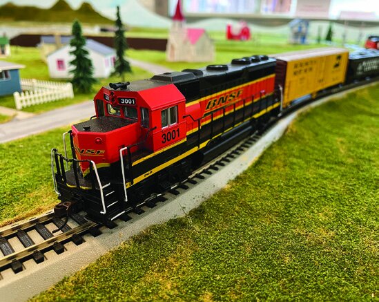 He has already spent an enormous amount of time building, designing, and engineering a three-train course with all the fixings for a lively little town. A freight train, a passenger train, and a Christmas train all call the display home. He continues to add new things every day. Dave feels it will take him six months to a year before he will be satisfied with the build, but the shop will continue to be open for business throughout the completion of the project.