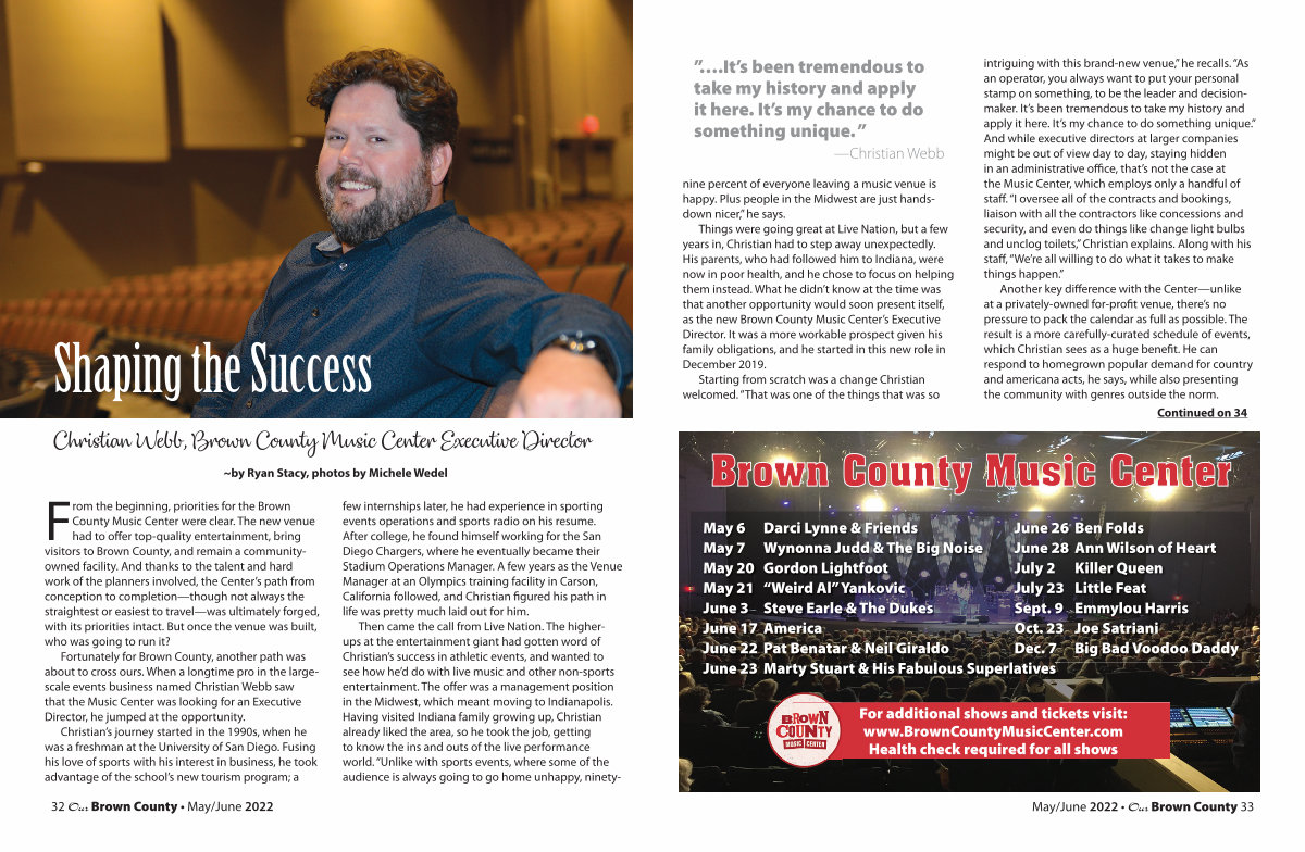 Things were going great at Live Nation, but a few years in, Christian had to step away unexpectedly. His parents, who had followed him to Indiana, were now in poor health, and he chose to focus on helping them instead. What he didn’ t know at the time was that another opportunity would soon present itself, as the new Brown County Music Center’ s Executive Director. It was a more workable prospect given his family obligations, and he started in this new role in December 2019.