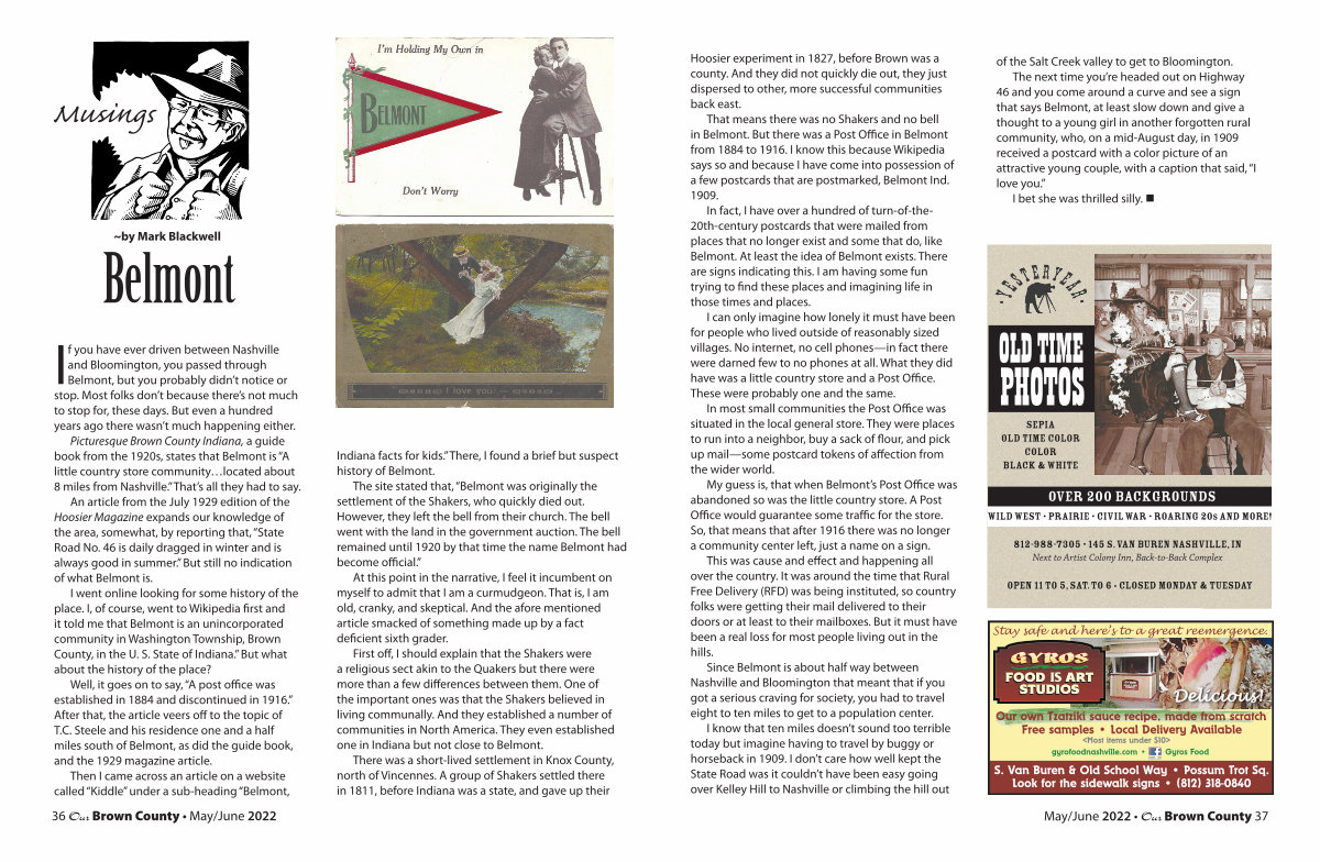 Picturesque Brown County Indiana, a guide book from the 1920s, states that Belmont is“ A little country store community … located about 8 miles from Nashville.” That’ s all they had to say.