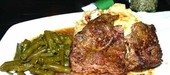 But, in the end, I ordered the Hard Truth meatloaf served with smashed red potatoes, green beans, and a brown gravy which purports to include bourbon.