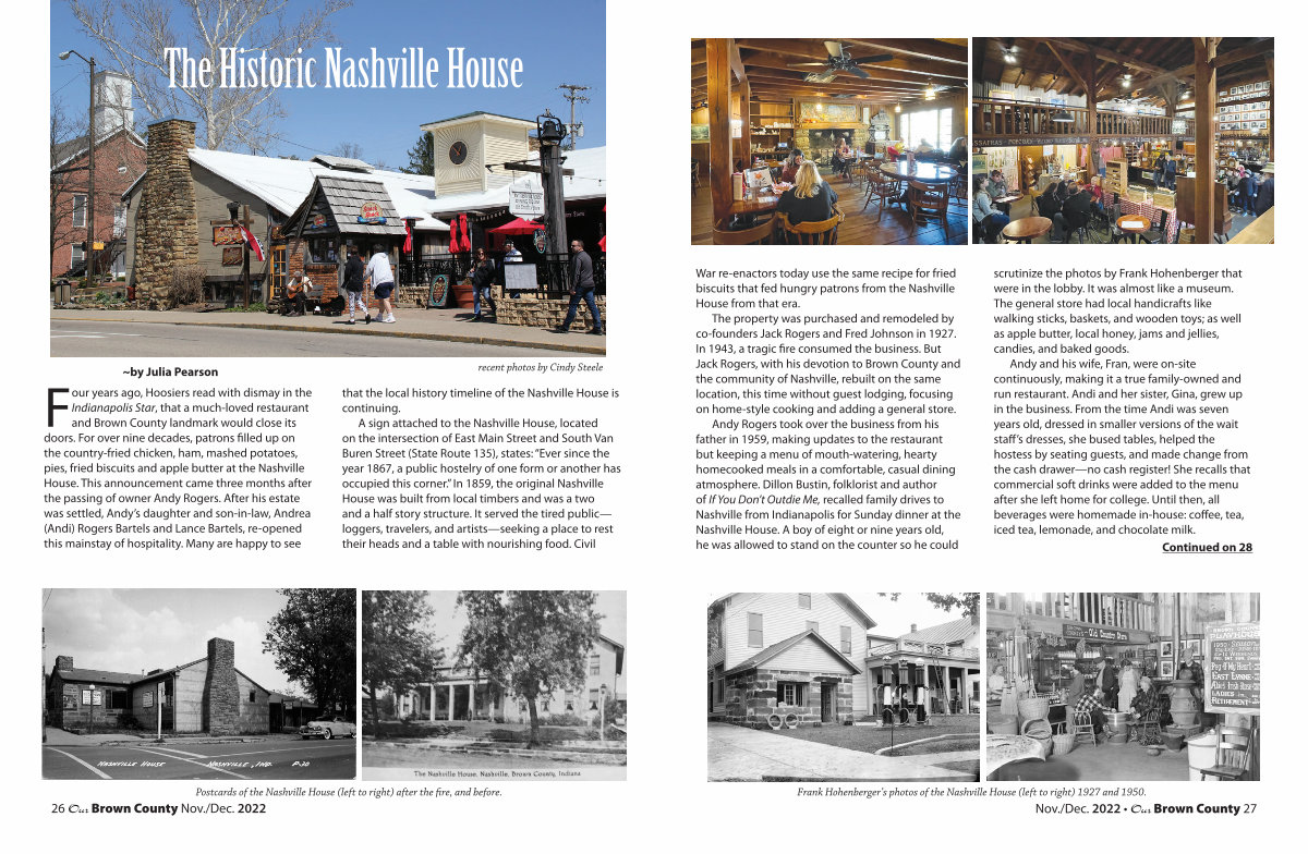 The property was purchased and remodeled by co-founders Jack Rogers and Fred Johnson in 1927. In 1943, a tragic fire consumed the business. But Jack Rogers, with his devotion to Brown County and the community of Nashville, rebuilt on the same location, this time without guest lodging, focusing on home-style cooking and adding a general store.