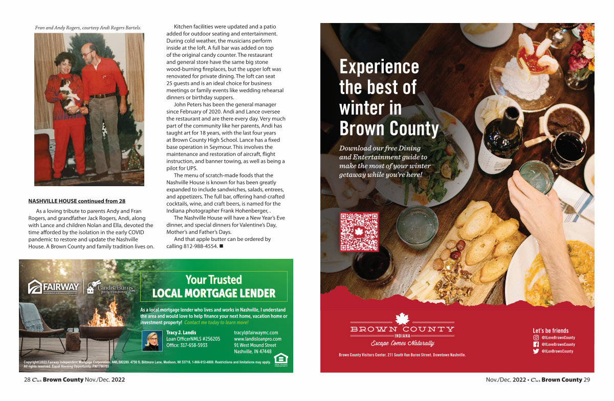 As a loving tribute to parents Andy and Fran Rogers, and grandfather Jack Rogers, Andi, along with Lance and children Nolan and Ella, devoted the time afforded by the isolation in the early COVID pandemic to restore and update the Nashville House. A Brown County and family tradition lives on.