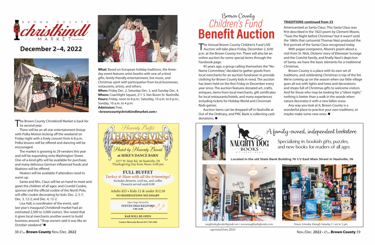 Auction will take place Friday, December 2, 6:00 p. m. at the Brown County Inn. There will also be an online auction for some special items through the Facebook page.