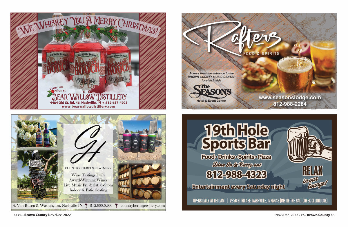 S. Van Buren & Washington, Nashville IN 812.988.8500 countryheritagewinery. com