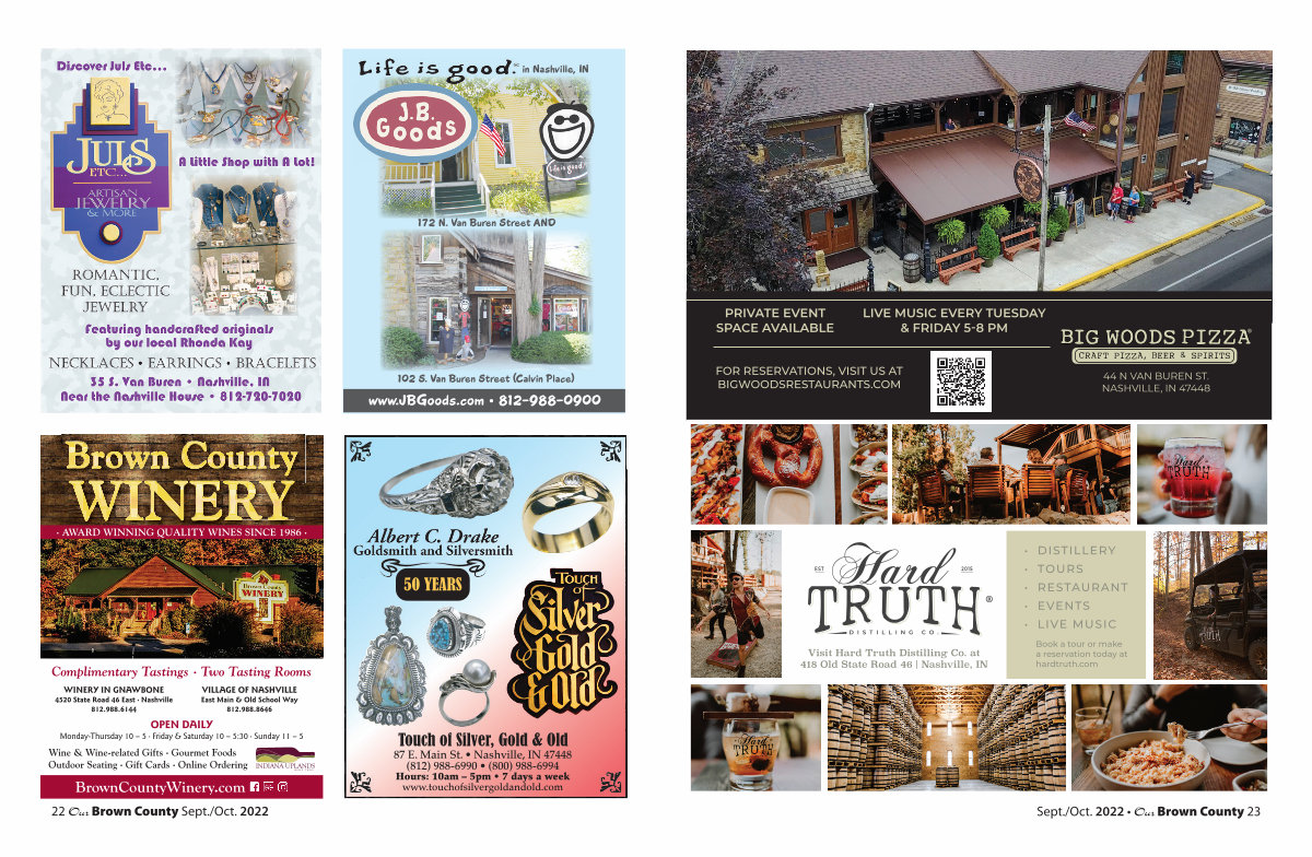 22 Our Brown County Sept./ Oct. 2022 102 S. Van Buren Street( Calvin Place) 172 N. Van Buren Street AND in Nashville, IN www. JBGoods. com • 812-988-0900 Touch of Silver, Gold & Old 87 E. Main St. • Nashville, IN 47448( 812) 988-6990 •( 800) 988-6994 Hours: 10am – 5pm • 7 days a week www. touchofsilvergoldandold. com 50 YEARS BrownCountyWinery. com Complimentary Tastings · Two Tasting Rooms WINERY IN GNAWBONE 4520 State Road 46 East · Nashville 812.988.6144 VILLAGE OF NASHVILLE East Main & Old School Way 812.988.8646 OPEN DAILY Monday-Thursday 10 – 5 · Friday & Saturday 10 – 5:30 · Sunday 11 – 5 Wine & Wine-related Gifts · Gourmet Foods Outdoor Seating · Gift Cards · Online Ordering Brown County Brown County Brown C Brown County Brown County Brown County Brown County Brown County Brown County Brown County Brown County Brown County Brown County Brown County Brown County Brown County Brown County Brown County Brown County Brown County Brown County Brown County Brown County Brown County Brown County Brown County Brown County Brown County Brown County Brown County Brown County Brown County Brown County Brown County Brown County Brown County Brown County Brown County Brown County Brown County Brown County Brown County Brown County Brown County Brown County Brown County Brown County Brown County Brown County Brown County Brown County Brown County Brown County Brown County Brown County Brown County Brown County Brown County Brown County Brown County Brown County Brown County Brown County Brown County Brown County Brown County Brown County Brown County Brown County Brown County Brown County Brown County Brown County Brown County Brown County Brown County Brown County Brown County Brown County Brown County Brown County Brown County Brown County Brown County Brown County Brown County Brown County Brown County Brown County Brown County Brown County Brown County Brown County Brown County Brown County Brown County Brown County Brown County Brown County Brown County Brown County Brown County Brown County Brown County Brown County Brown County Brown County Brown County Brown County Brown County Brown County Brown County Brown County Brown County Brown County Brown County Brown County Brown County Brown County Brown County Brown County Brown County Brown County Brown County Brown County Brown County Brown County Brown County Brown County Brown County Brown County Brown County Brown County Brown County Brown County Brown County Brown County Brown County Brown County Brown County Brown County Brown County Brown County Brown County Brown County Brown County Brown County Brown County Brown County Brown County Brown County Brown County Brown County Brown County Brown County Brown County Brown County Brown County Brown County Brown County Brown County Brown County Brown County Brown County Brown County Brown County Brown County Brown County Brown County Brown County Brown County Brown County Brown County Brown County Brown County Brown County Brown County Brown County Brown County Brown County Brown County Brown County Brown County Brown County Brown County Brown County Brown County Brown County Brown County Brown County Brown County Brown County Brown County Brown County Brown County Brown County Brown County Brown County Brown County Brown County Brown County Brown County Brown County Brown County Brown County Brown County Brown County Brown County Brown County Brown County Brown County Brown County Brown County Brown County Brown County Brown County Brown County Brown County Brown County Brown County Brown County Brown County Brown County Brown County Brown County Brown County Brown County Brown County Brown County Brown County Brown County Brown County Brown County Brown County Brown County Brown County Brown County Brown County Brown County Brown County Brown County Brown County Brown County Brown County Brown County Brown County Brown County Brown County Brown County Brown County Brown County Brown County Brown County Brown County Brown County Brown County Brown County Brown County Brown County Brown County Brown County Brown County Brown County Brown County Brown County Brown County Brown County Brown County Brown County Brown County Brown County Brown County Brown County Brown County Brown County Brown County Brown County Brown County Brown County Brown County Brown County Brown County Brown County Brown County Brown County Brown County Brown County Brown County Brown County Brown County Brown County Brown County Brown County Brown County Brown County Brown County Brown County Brown County Brown County Brown County Brown County Brown County Brown County Brown County Brown County Brown County Brown County Brown County Brown County Brown County Brown County Brown County Brown County Brown County Brown County Brown County Brown County Brown County Brown County Brown County Brown County Brown County Brown County Brown County Brown County Brown County Brown County Brown County Brown County Brown County Brown County Brown County Brown County Brown County Brown County Brown County Brown County Brown County Brown County Brown County Brown County Brown County Brown County Brown County Brown County Brown County Brown County Brown County Brown County Brown County Brown County Brown County Brown County Brown County Brown County Brown County Brown County Brown County Brown County Brown County Brown County Brown County Brown County Brown County Brown County Brown County Brown County Brown County Brown County Brown County Brown County Brown County Brown County Brown County Brown County Brown County Brown County Brown County Brown County Brown County Brown County Brown County Brown County Brown County Brown County Brown County Brown County Brown County Brown County Brown County Brown County Brown County Brown County Brown County Brown County Brown County Brown County Brown County Brown County Brown County Brown County Brown County Brown County Brown County Brown County Brown County Brown County
