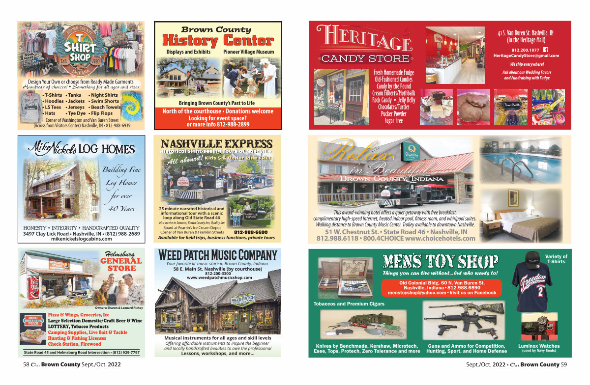 58 Our Brown County Sept./ Oct. 2022 Brown County History Center History Center Pioneer Village Museum Bringing Brown County’ s Past to Life Displays and Exhibits Looking for event space? or more info 812-988-2899 North of the courthouse • Donations welcome All aboard! Ki Ki Ki Ki Ki Ki Ki Ki Ki Ki Ki Ki Ki Kids ds ds ds ds ds ds ds ds ds ds ds ds ds ds ds ds ds ds 5 & Und nd nd nd nd nd nd nd nd nder er er er er er er er er er er er er er er er er er er er er er er er er er er er er er er Rid id id id id id id id id id id id id id id id id id id id id id id id id id id id id id id id id id id id id id id id id id id id id id id id id id id id id id id id id id id id id id id id id id id id id id id id id id id id id id id id id id id ide FR FR FR FR FR FR FR FR FR FR FR FR FR FR FR FR FR FR FR FR FR FREE EE EE EE EE EE EE EE EE EE EE EE EE EE EE EE EE EE EE EE EE EE EE EE EE EE EE EE EE EE EE EE EE EE EE EE EE EE EE EE EE EE EE EE E Kids 5 & Under Ride FREE Board at Fearrin’ s Ice Cream Depot Corner of Van Buren & Franklin Streets 25 minute narrated historical and informational tour with a scenic loop along Old State Road 46 Available for field trips, business functions, private tours 812-988-6690 Hi Hi Hi Hi Hi Hi Hi Hi Hi Hi Hi Hi t st st st st st st st st st st st st st st st st st st st st st st st st st st st st st st st st st st st st st st st st st st st st st st st st st st st st st st st st st st st st st st st st st st st st st st st st st st st st st st st st st st st st st st st st st st st s or or or or or or or or or or or or or or or or or or or or or or or or or or or or or or or or or or or or or or or or or or or or or or or or or or or or or or or or or or or or or or or or or or or or or or or or or or or or or or or or or or or o ic ic ic ic ic ic ic ic ic ic ic ic ic ic ic ic ic ic ic ic ic ic ic ic ic ic ic ical al al al al al al al al al al al al al al al al al al al al al al al al al al al al al al al al al al al al al al al al al al al al al al al al al al al al al Sig ig ig ig ig ig ig ig ig ig ig ig ig ig ig ig ig ig ig ig ig ig ig ig ig ig ig ig ig ig ig ig ig ig ig ig ig ig ig ight ht ht ht ht ht ht ht ht ht ht ht ht ht ht ht ht ht ht ht ht ht ht ht ht ht ht ht ht ht ht ht ht ht ht ht ht ht ht ht ht ht ht ht ht ht ht ht ht ht ht ht ht ht ht ht ht ht ht ht ht ht h s-s-s-s-s-s-s-s-s-s-s-s-s-s-s-s-s-s-s-s-s-s-s-s-s-s-s-s-s-s-s-s-s-s-s-s-s-s-s-s-s-s-s-s-s-see ee ee ee ee ee ee ee ee ee ee ee ee ee ee ee ee ee ee ee ee ee ee ee ee ee ee ee ee ee ee ee ee ee ee ee ee ee ee ee ee ee ee ee ee ee ee ee ee ee ee ee ee ee ee ee ee ee ee ee ee ee ee ee ee ee ee ee ee eein in in in in in in in in in in in in in in in in in in in in in in in in in in in in in in in in in in in in in in in in in in in in in in in in in in in in in in in in in in in in in in in in in in in in in in in in in in in ing To To To To To To To To To To To To To To To To To To To To To To To To To To To To To To To To To To To To To To To To To To To To To To To To To To To To To To To To To To To To To To To To To To To To To To To To To To To To To To To To To To To T ur ur ur ur ur ur ur ur ur ur ur ur ur ur ur ur ur ur ur ur ur ur ur ur ur ur ur ur ur ur ur ur ur ur ur ur ur ur ur ur ur ur ur ur ur ur ur ur ur ur ur ur ur ur ur ur ur ur ur ur ur u s of of of of of of of of of of of of of of of of of of of of of of of of of of of of of of of of of of of Nas as as as as as as as as as as as as as as as as as as as as as as as as as as as as as ashv hv hv hv hv hv hv hv hv hv hv hv hv hv hv hv hv hv hv hv hv hv hv hv hv hv hv hv hv hv hv hv hv hv hv hv hv hv hv hv hv hv hv hv hv hv hv hv hv hv hv hv hv hv hv hv hv hv hv hv hv hv hv hv hv hv hv h il il il il il il il il il il il il il il il il il il il il il il ille le le le le le le le le le le le le le le le le le le Historical Sight-seeing Tours of Nashville also service to Seasons, Brown County Inn, Quality Inn NASHVILLE EXPRESS NASHVILLE EXPRESS 3497 Clay Lick Road • Nashville, IN •( 812) 988-2689 mikenickelslogcabins. com HONESTY • INTEGRITY • HANDCRAFTED QUALITY Building Fine Log Homes for over 40 Years Design Your Own or choose from Ready Made Garments Hundreds of choices! • Something for all ages and sizes • Tanks • Jackets • Jerseys • Tye Dye • T-Shirts • Hoodies • LS Tees • Hats • Night Shirts • Swim Shorts • Beach Towels • Flip Flops Corner of Washington and Van Buren Street( Across from Visitors Center) Nashville, IN • 812-988-6939 Pizza & Wings, Groceries, Ice Large Selection Domestic / Craft Beer & Wine LOTTERY, Tobacco Products Camping Supplies, Live Bait & Tackle Hunting & Fishing Licenses Check Station, Firewood State Road 45 and Helmsburg Road Intersection •( 812) 929-7797 Owners: Sharon & Leonard Richey Helmsburg GENERAL STORE Weed Patch Music Company Weed Patch Music Company Offering affordable instruments to inspire the beginner and locally handcrafted beauties to awe the professional Musical instruments for all ages and skill levels Lessons, workshops, and more... Your favorite lil’ music store in Brown County, Indiana 58 E. Main St. Nashville( by courthouse) www. weedpatchmusicshop. com 812-200-3300