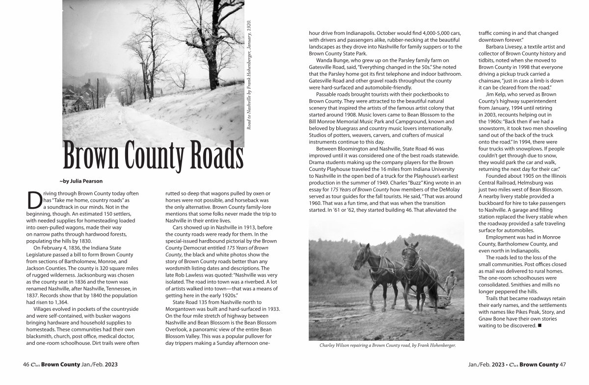Cars showed up in Nashville in 1913, before the county roads were ready for them. In the special-issued hardbound pictorial by the Brown County Democrat entitled 175 Years of Brown County, the black and white photos show the story of Brown County roads better than any wordsmith listing dates and descriptions. The late Rob Lawless was quoted: “Nashville was very isolated. The road into town was a riverbed. A lot of artists walked into town—that was a means of getting here in the early 1920s.”